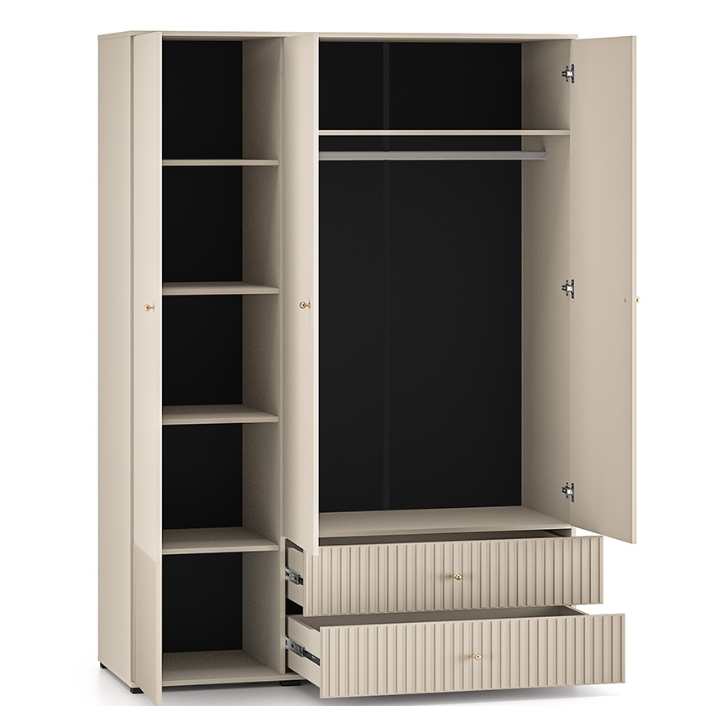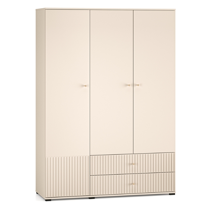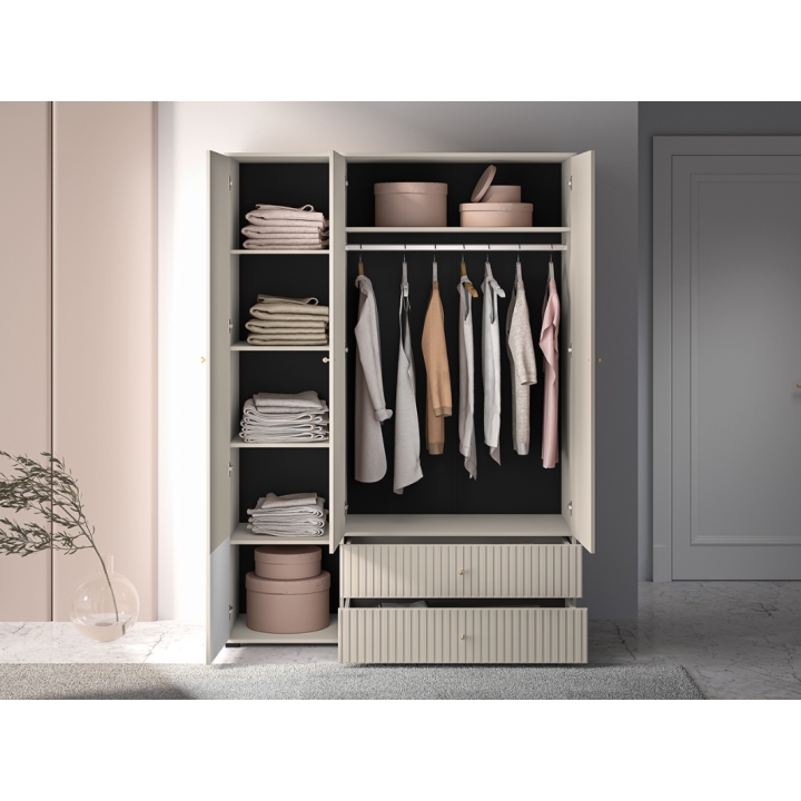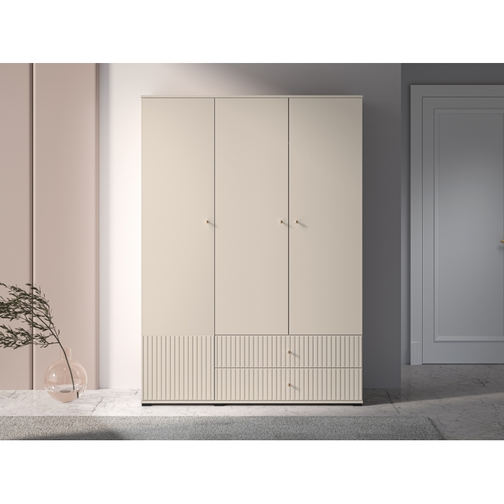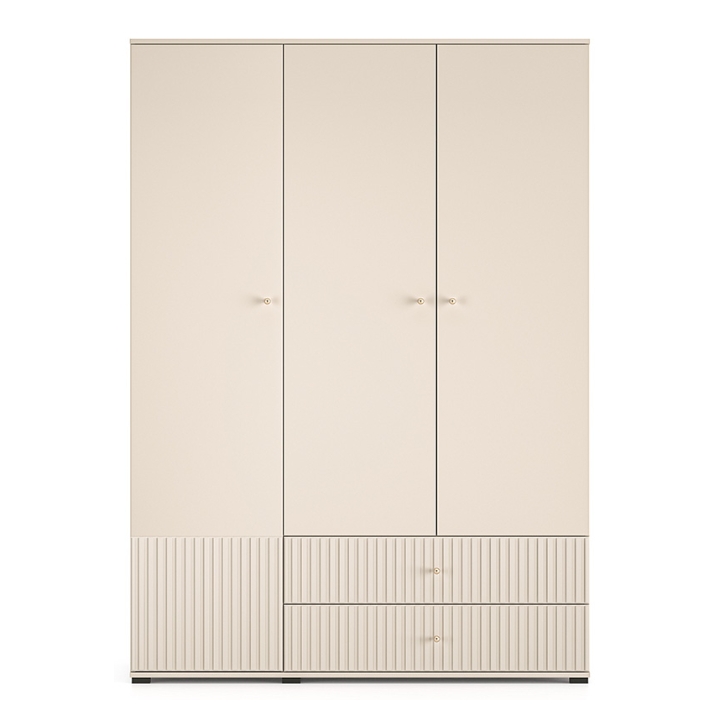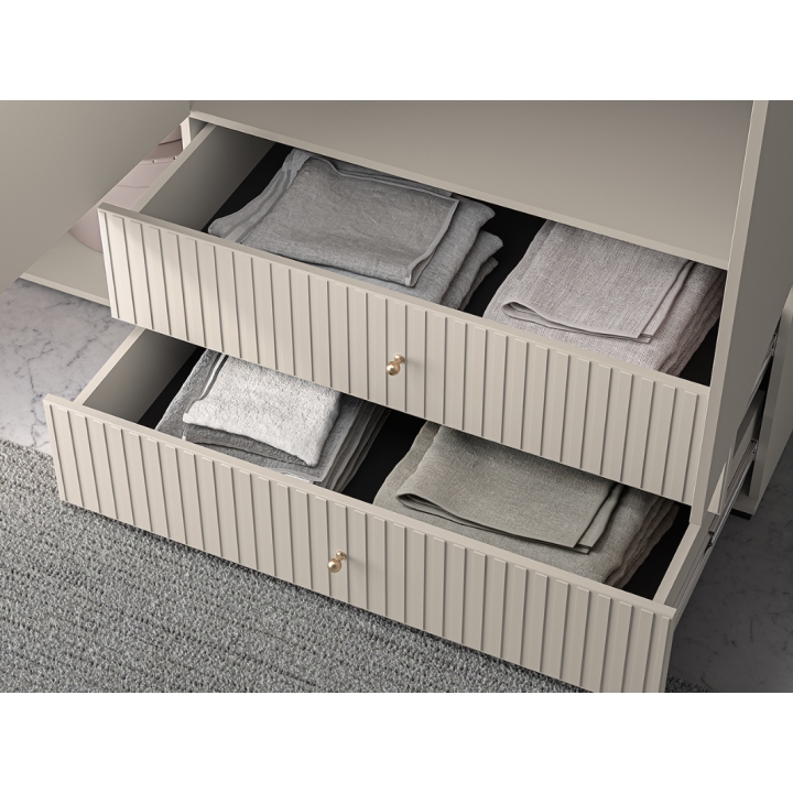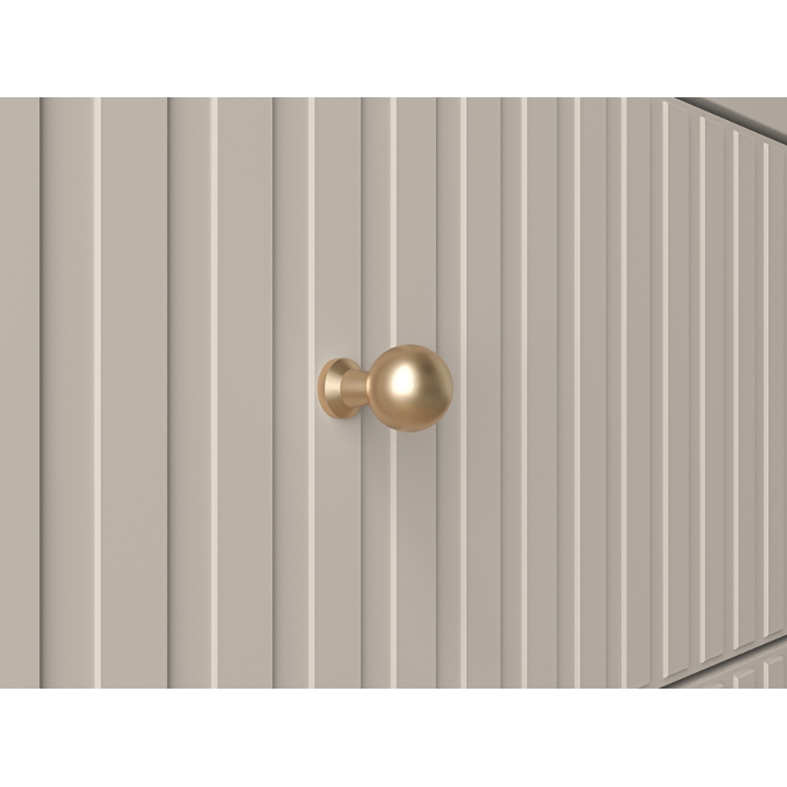 The aesthetic of the Sophie cabinet impresses with its cashmere finish, which emphasises its modern character and brings an elegant touch to the interior. The milled MDF fronts add subtle texture, while the gold metal handles, with a brushed finish, create a harmonious whole. The black high legs not only add visual lightness to the piece, but also make it easier to clean underneath the furniture, which is particularly practical for everyday use.