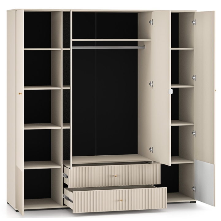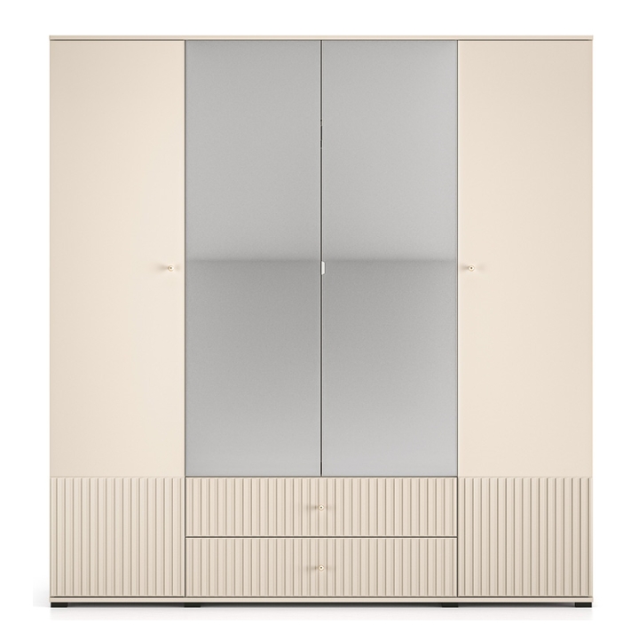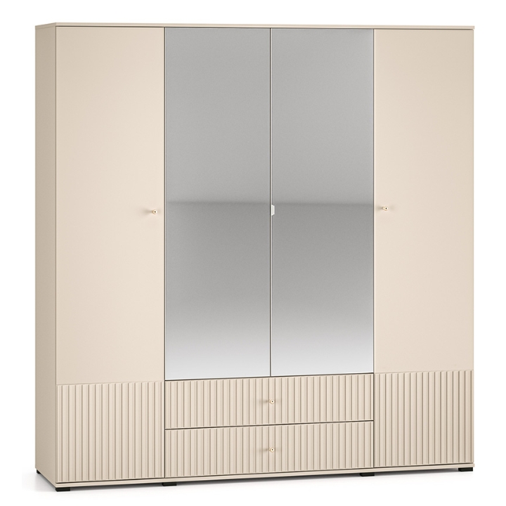 The Sophie Type 23 wardrobe is a spacious piece of furniture that is perfect for any modern bedroom. Equipped with four doors, including two central doors with large mirrors, which help with daily preparations and optically enlarge the room. The interior of the wardrobe is divided into several sections, with space for hanging clothes, as well as shelves and drawers for storing a variety of items.