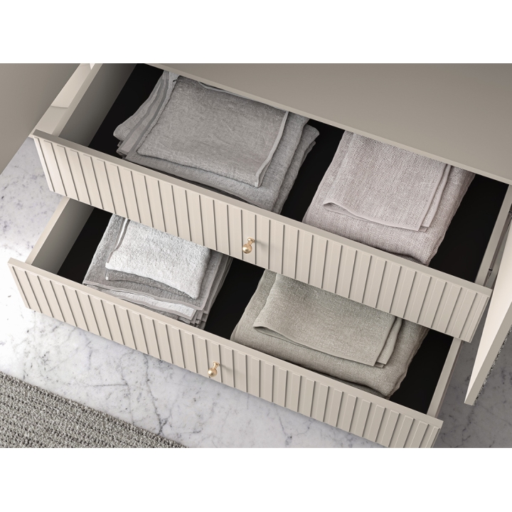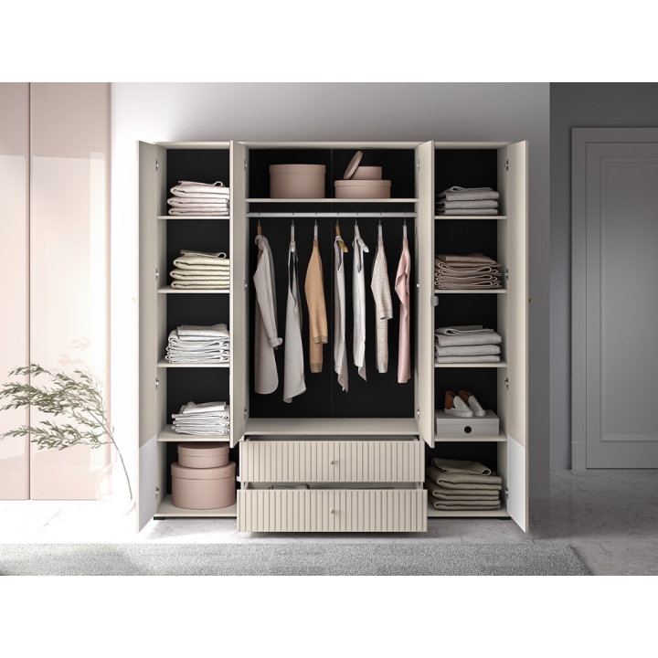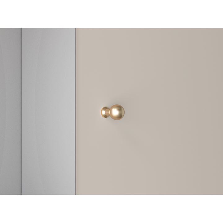 The cashmere décor in combination with the matt finish of the fronts and the body gives the wardrobe a modern character. The milled MDF fronts and subtle brushed gold handles emphasise the attention to detail. Additionally, the lower part of the wardrobe is equipped with two spacious drawers, which will be ideal for storing linen or other accessories.