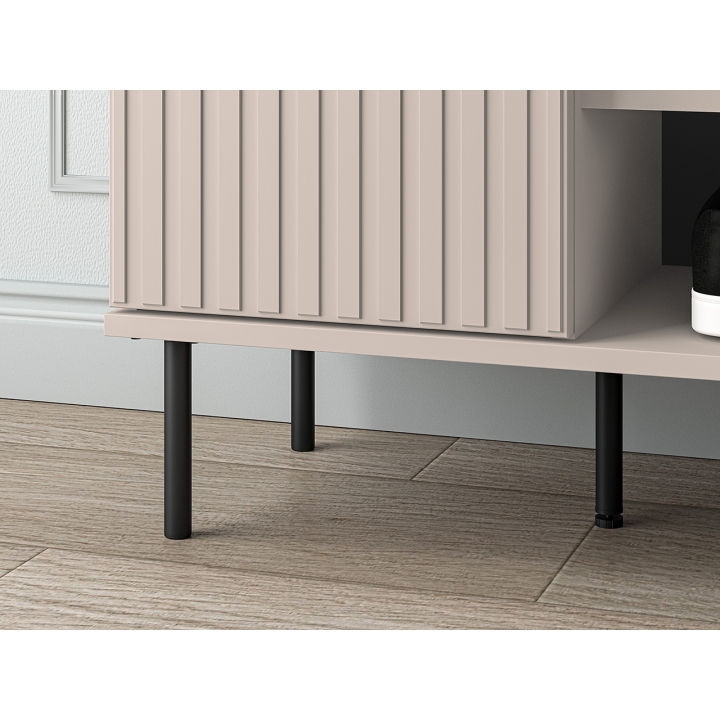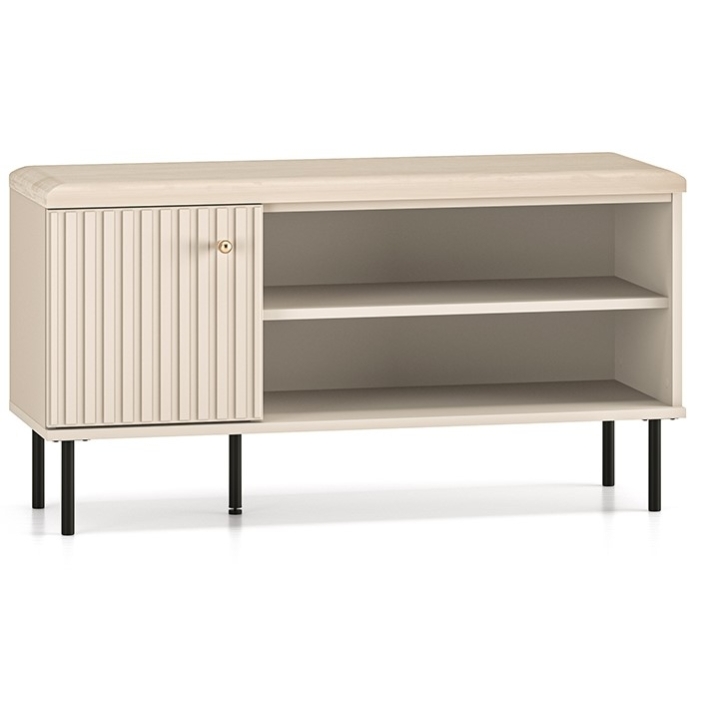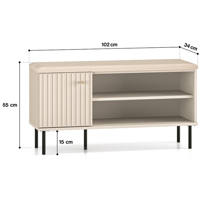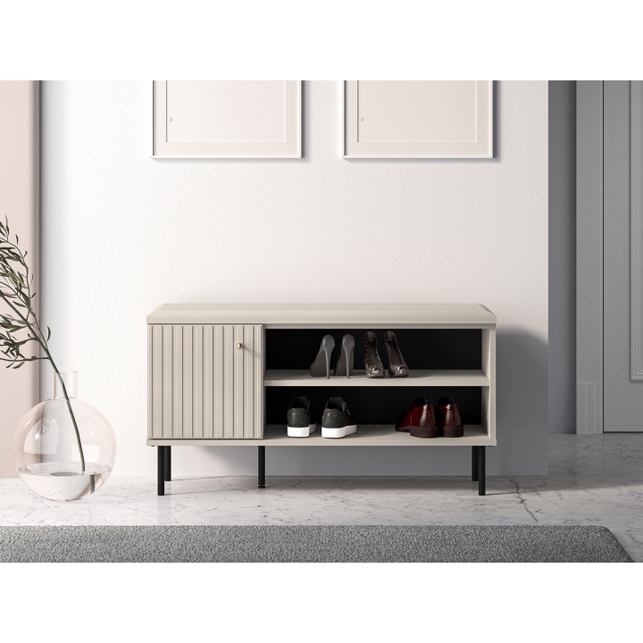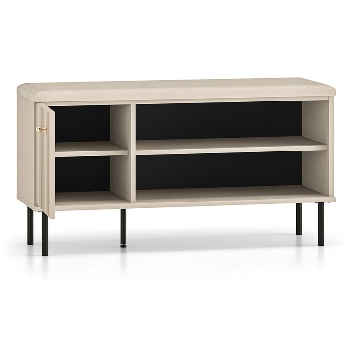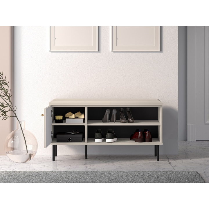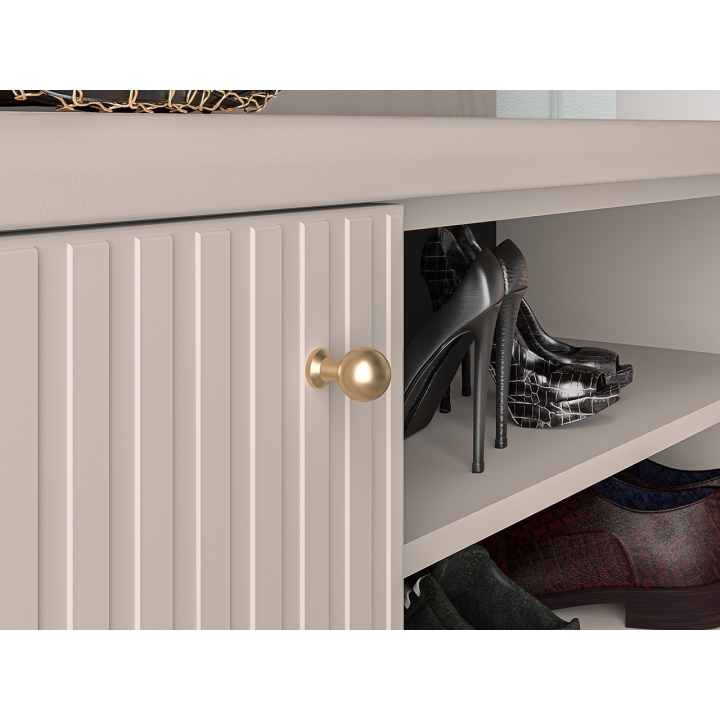 The cashmere-coloured upholstered seat adds subtlety and comfort, while the milled MDF fronts and gold handles add a unique touch. This beige shoe cabinet on high legs will not only blend perfectly into modern settings, but will also become a stylish accent in any hallway.