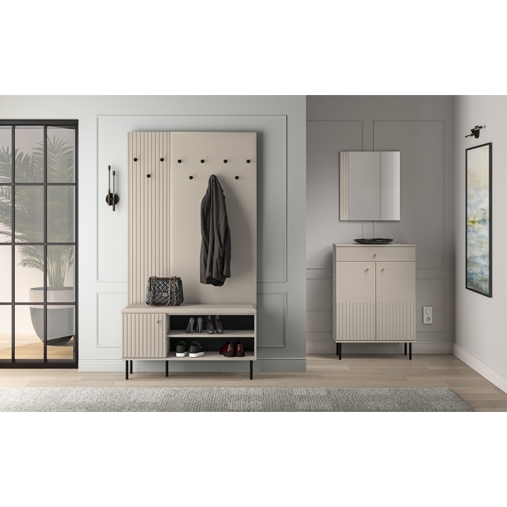 Discover how the modern seated shoe cabinet will add a unique touch to your space, while offering convenient shelf solutions and elegant details. Choose a cashmere shoe cabinet with milled fronts and create a stylish entrance to your home!