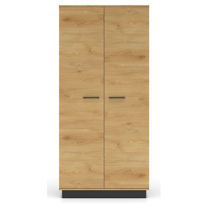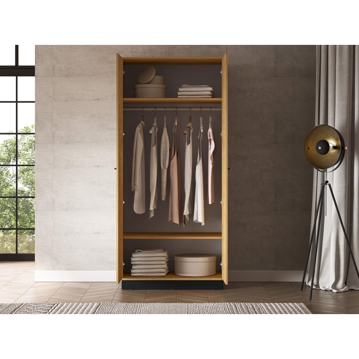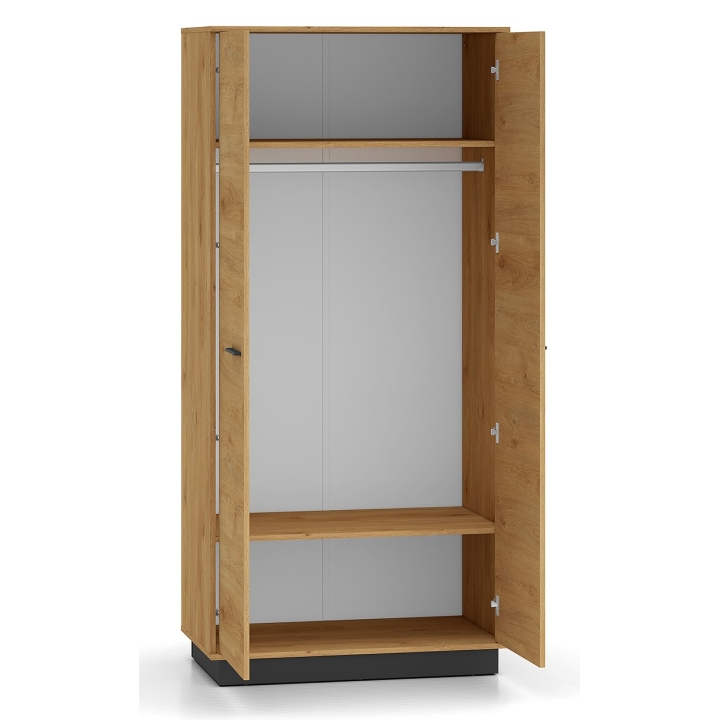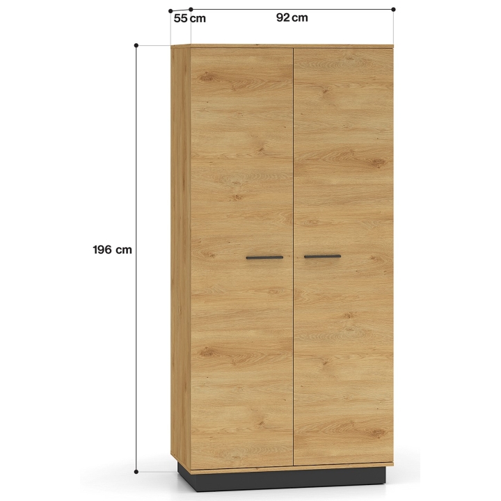 The 196 cm high, 92 cm wide and 55 cm deepdesign provides space for clothing and accessories. The interior has been fitted with two shelves and a bar, allowing clothes to be conveniently arranged. The quiet closing system guarantees comfortable use, and the solid construction contributes to the durability of the furniture. The entire unit weighs 68.5 kg and the volume of the furniture is 0.992 m³.