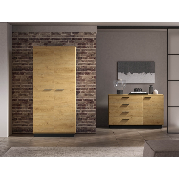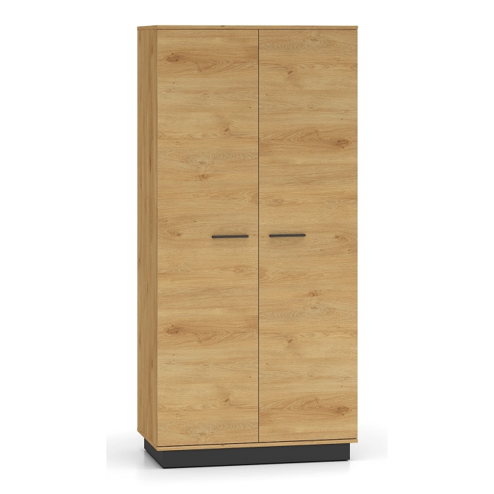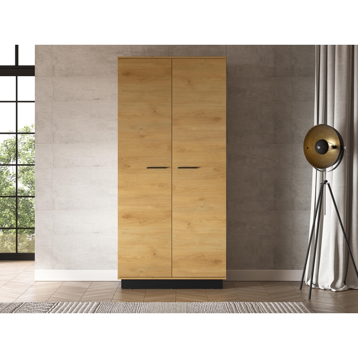 The Modesto 01 wardrobe by ML Meble is a two-door model in a combination of oak staining and black accents. The black base and handles add to its distinctiveness, creating a coherent composition. The subtle, geometric form makes it fit into both modern and classic interiors.