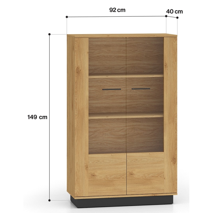 The Modesto 03 two-door vitrine, designed by manufacturer ML Meble, combines the natural charm of oak with contrasting black accents to create a distinctive visual effect. Its dimensions are 149 cm high, 92 cm wide and 40 cm deep, ensuring a harmonious balance between compact form and roomy interior. The sturdy construction with a weight of 50 kg guarantees stability, and thoughtful details underline the high quality of the workmanship.