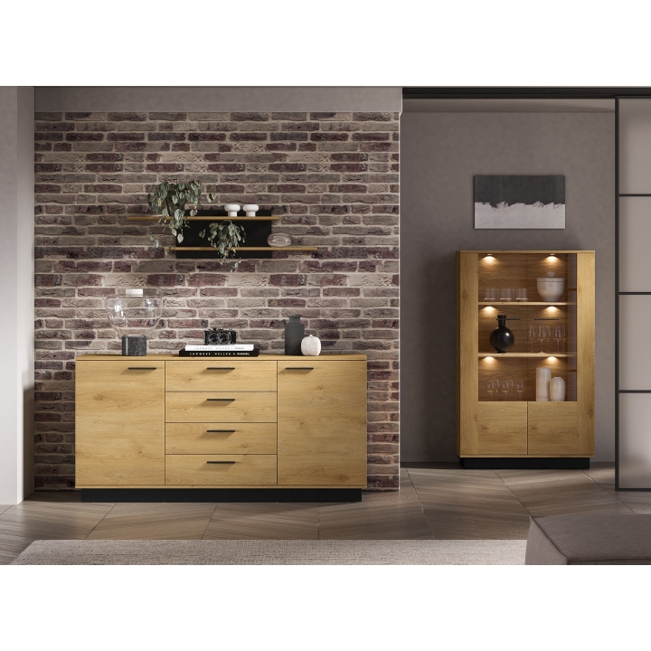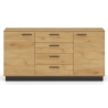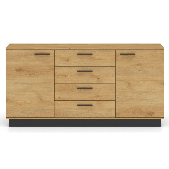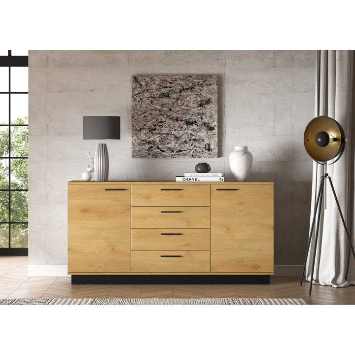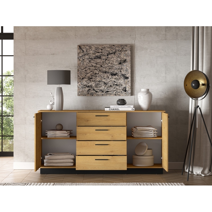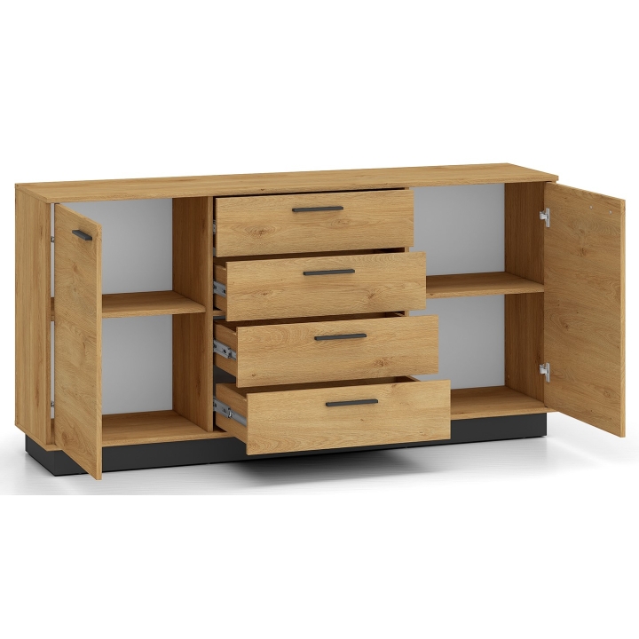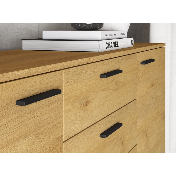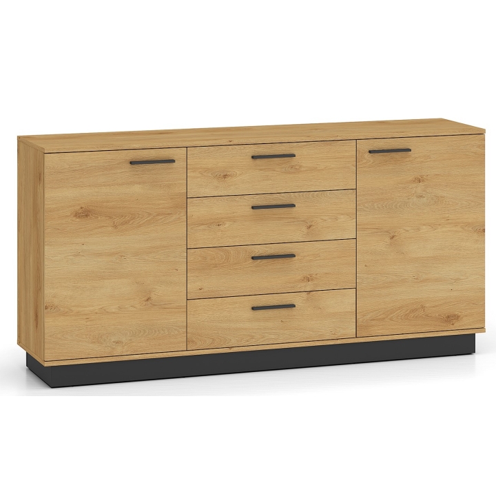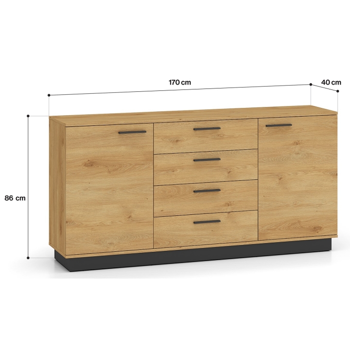 The Modesto 04 chest of drawers from manufacturer ML Meble combines the natural aesthetics of stylish oak with contrasting black accents. Measuring 170 cm wide, 86 cm high and 40 cm deep, the furniture provides ample storage space and its solid construction weighs 65 kg. The clever layout includes four drawers and two doors, behind which spacious shelves are concealed, offering optimum interior management.