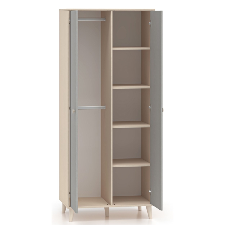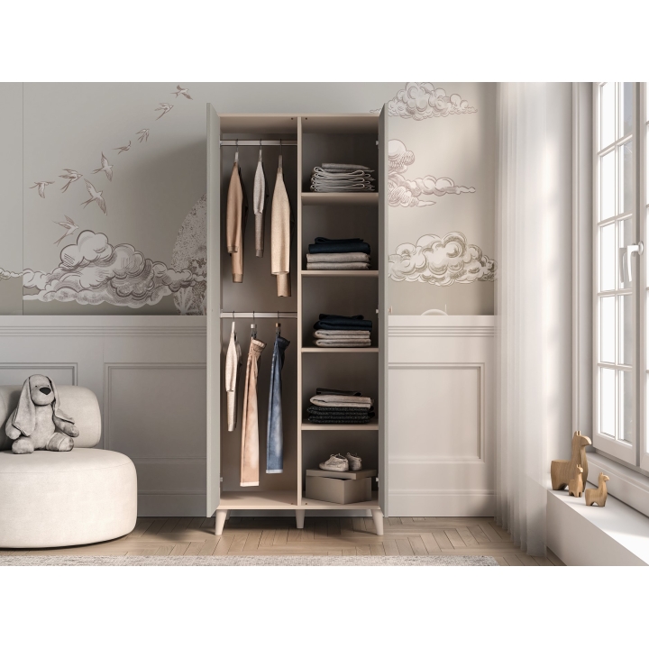 The doors are equipped with a soft-closing system, which ensures smooth and noiseless closing. The interior has been designed for convenient access to clothes both on hangers and those stored on shelves. The well-thought-out design allows for optimal use of the available space.