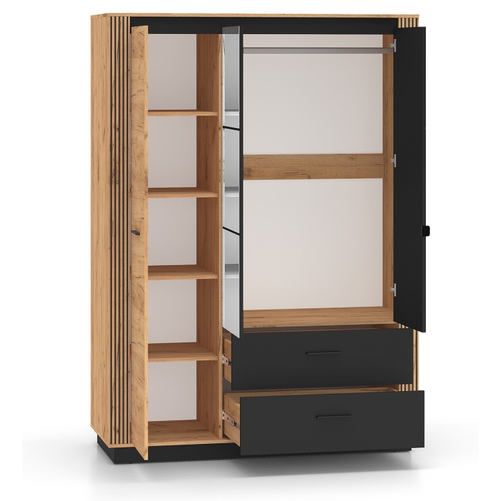 The wardrobe with a soft-close, full-extension drawers and increased drawer capacity makes use comfortable. Inside, there is a hanger bar, five shelves and two drawers to keep clothes and other items organised. Black handles make it easy to open the doors and the solid construction ensures the stability of the furniture.