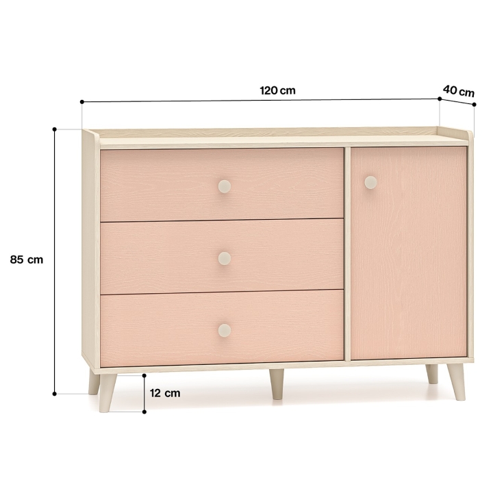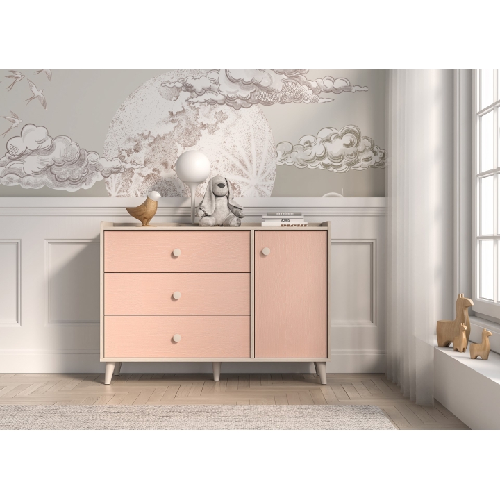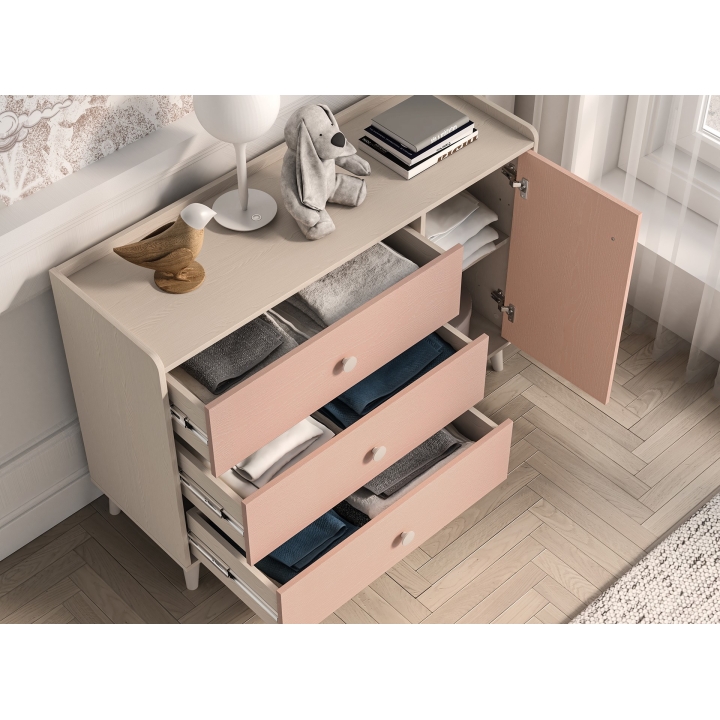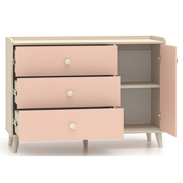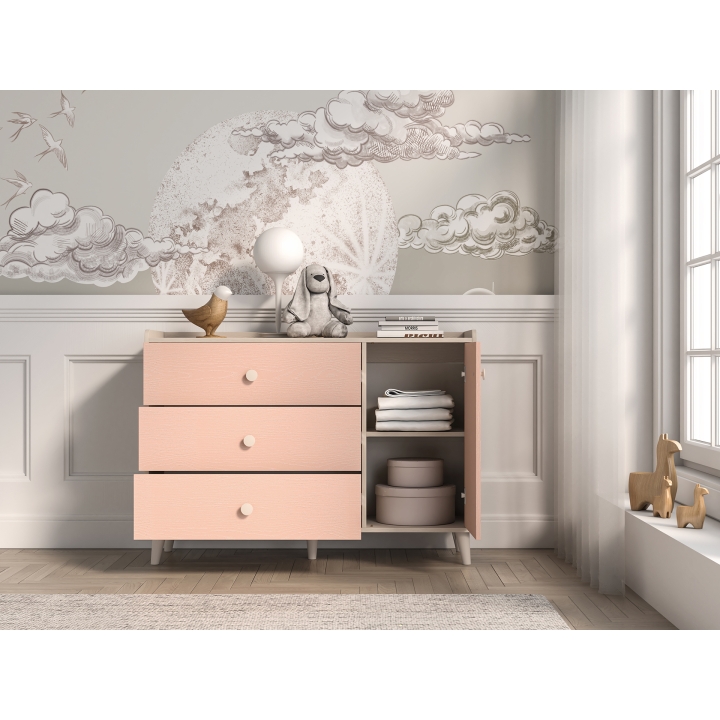The Mevel 05 chest of drawers from ML Meble is available in two colour variants - a combination of sandy beige with grey- Grey Palladium or pink- Millenian Pink. It is a capacious piece of furniture that offers three drawers and a cupboard with doors hiding additional storage space. The slender legs add to its visual lightness, emphasising the subtle character of the design, and the compact dimensions allow it to be placed even in smaller rooms.