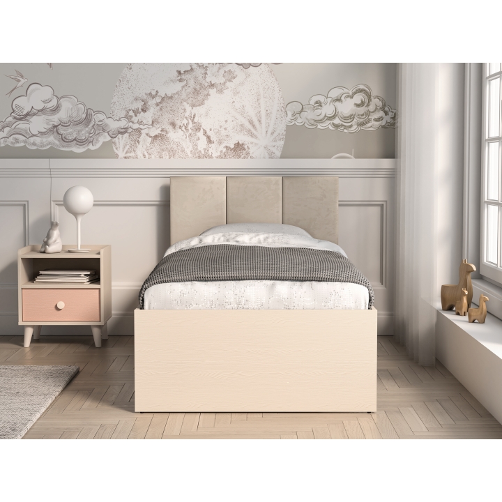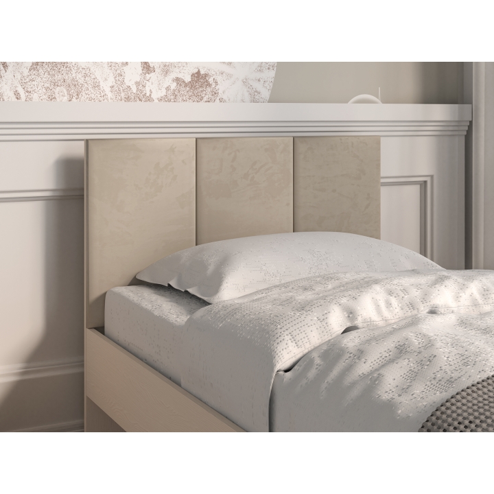 The velour headrest in beige adds softness and comfort to the bed. The fabric is pleasant to the touch and its dense structure makes it stand up well to daily use.