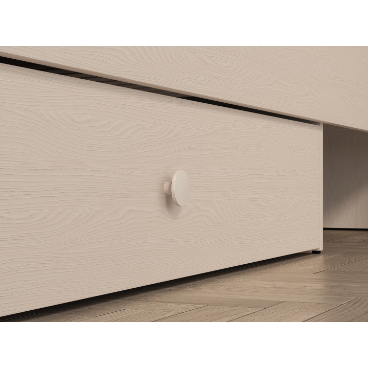Youth bed Mevel 08 by ML Meble is a solid piece of furniture equipped with an additional bedding container in the form of a pull-out drawer. The construction allows for assembly in a right- or left-sided version, which makes it possible to adjust the layout to the room layout. The neutral colour scheme in a shade of sandy beige makes the bed blend harmoniously with a variety of interior arrangements.