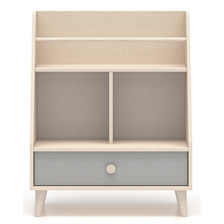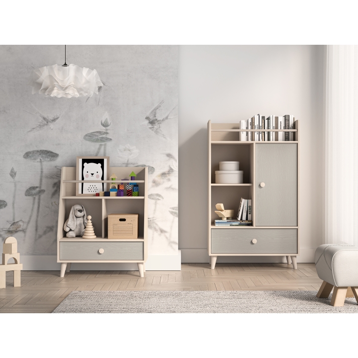 The Mevel 09 children's bookcase from ML Meble is a compact and well thought-out piece of storage furniture. The colour scheme of Sand Beige has been combined with a front in pink - Millenial Pink or grey - Palladium Grey. Its design combines open and closed spaces, allowing various items to be conveniently arranged. The top shelf, which is protected against accidental slipping of objects, is perfect for books or toys.