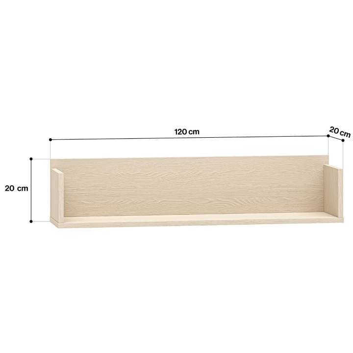 The model measures 90 cm in width, 20 cm in height and 20 cm in depth, allowing for the placement of books, ornaments or other small items. The lightweight construction of 5 kg makes it easy to mount on the wall while ensuring stability. This makes the shelf a practical complement to the room furnishings.