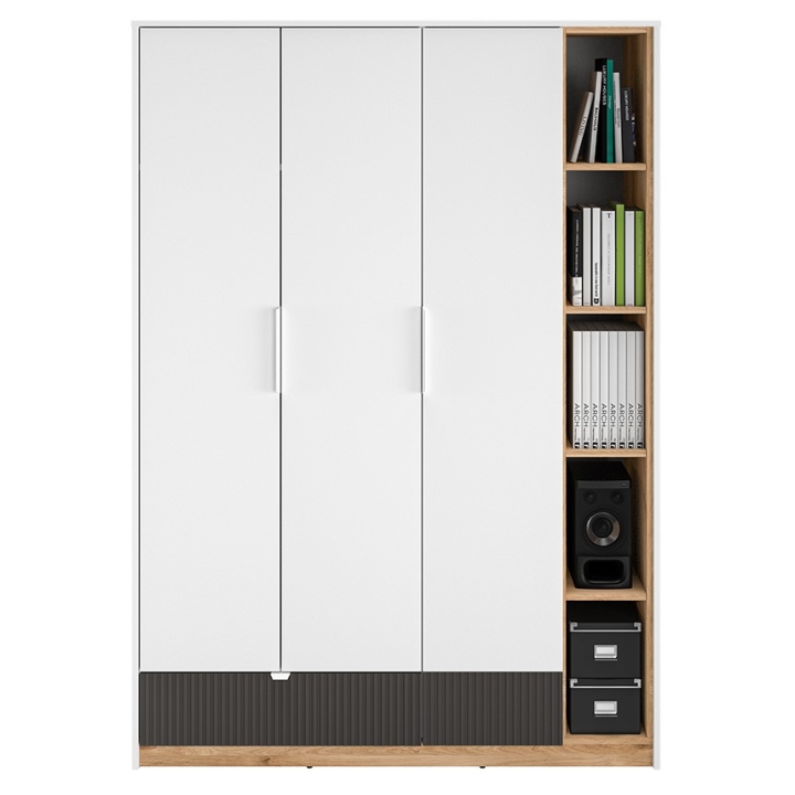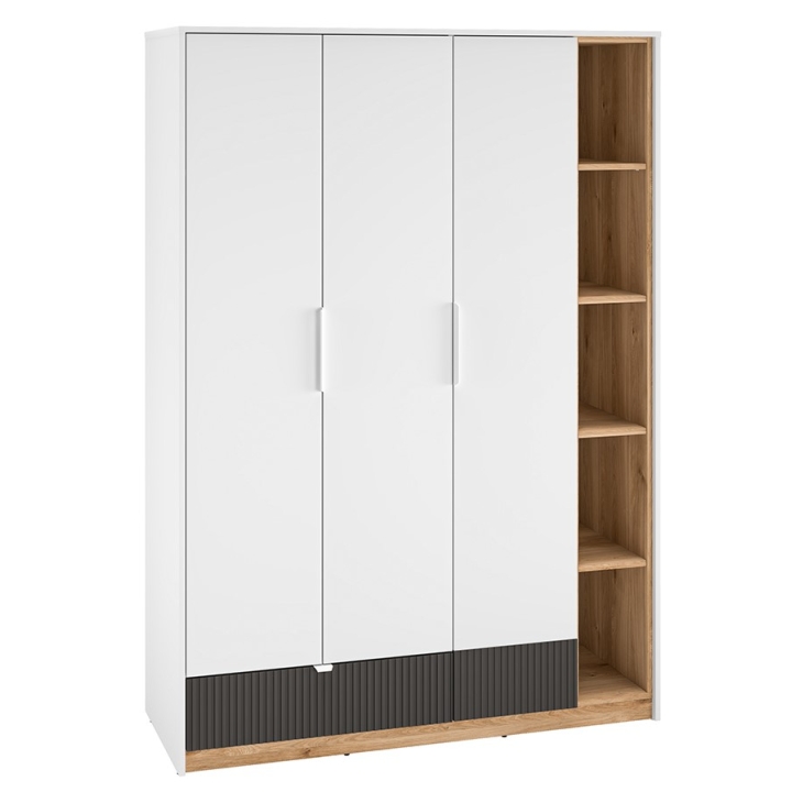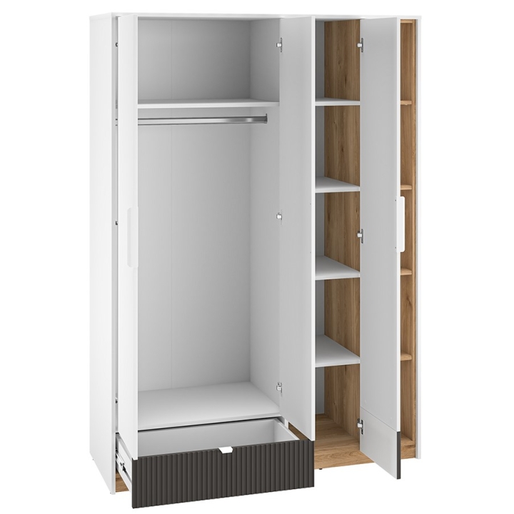 The Torino 01 wardrobe by ML Meble is a modern model with a height of 196 cm, a width of 138 cm and a depth of 53 cm, which combines capacity with a variety of storage options. The three-door design conceals a spacious clothes rail and a wide shelf, while the side section offers four narrower shelves. An additional feature is the graphite contrasting MDF drawer which serves both a practical and decorative function.