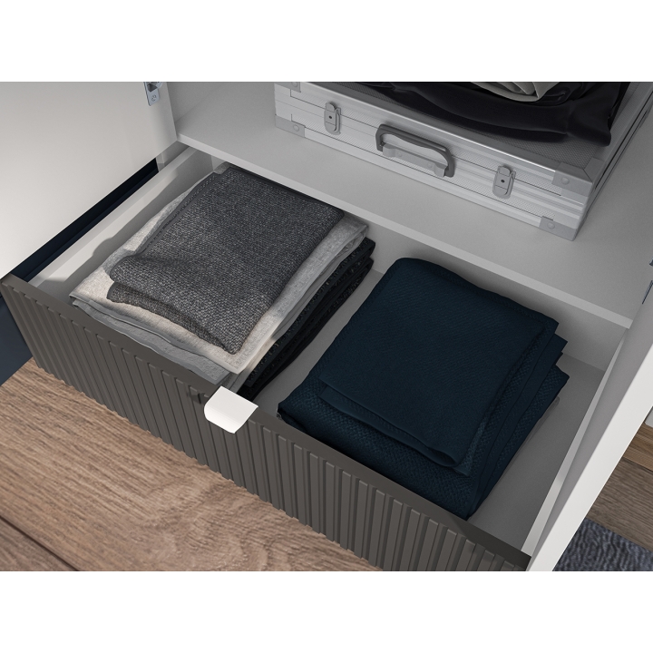 A distinctive accent of the wardrobe is the integrated bookcase in Castello Oak, which is not only a striking detail but also provides additional space for organisation. It can be used to store books, display ornaments or as a place for everyday objects. The well-thought-out design makes this model suitable for youth rooms and anywhere else where optimal interior management is important.