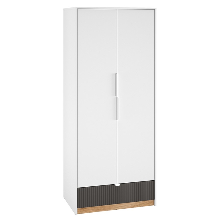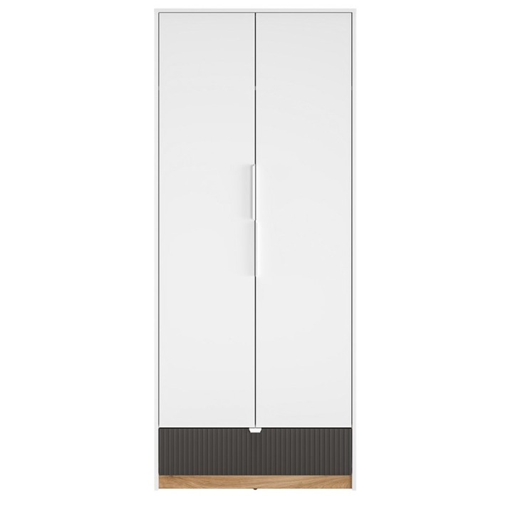 The two-door wardrobe Torino 02 from the manufacturer ML Meble combines a classic body with contrasting elements in shades of graphite and oak. The model with a height of 196 cm, width of 82 cm and depth of 53 cm will prove useful in various interior arrangements. Thanks to its carefully designed interior, it provides convenient storage for clothes and accessories.