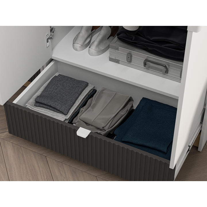 The interior of the wardrobe consists of a clothes rail, a spacious shelf and a capacious drawer located in the lower part of the furniture. The applied soft-closing system allows for smooth and almost noiseless closing of the door. The drawer has a full-extension mechanism for easy access to stored items.