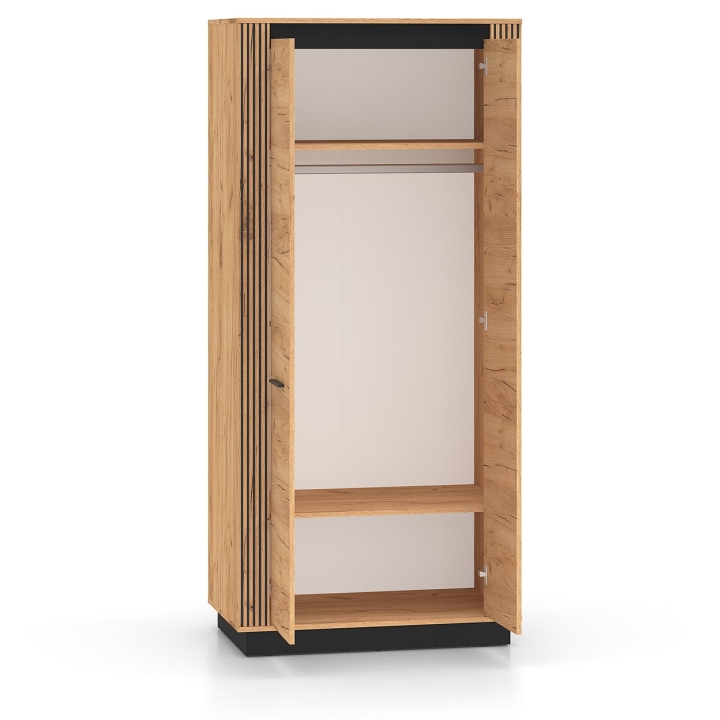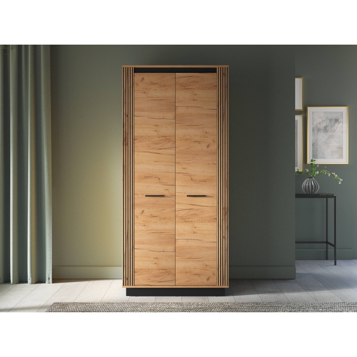 Two-door wardrobe Urso 03 by ML Meble is a proposal for people looking for a compact, but capacious piece of furniture for storage. Thanks to the decorative slats on the front and the colour combination in shades of wood and black, it fits perfectly in modern interiors. It will be perfect for a hallway, bedroom or wardrobe.