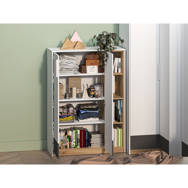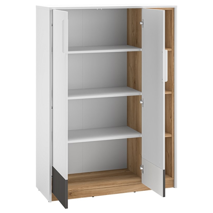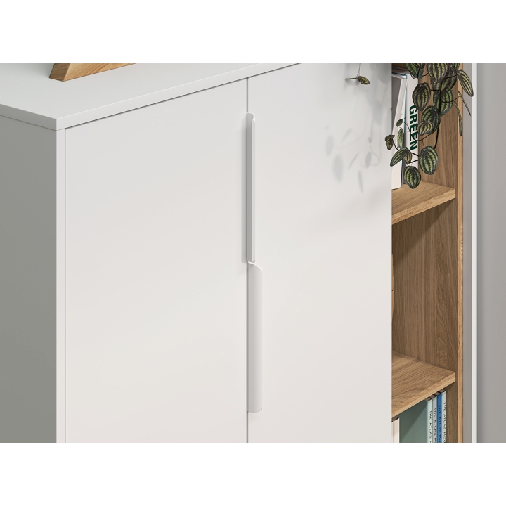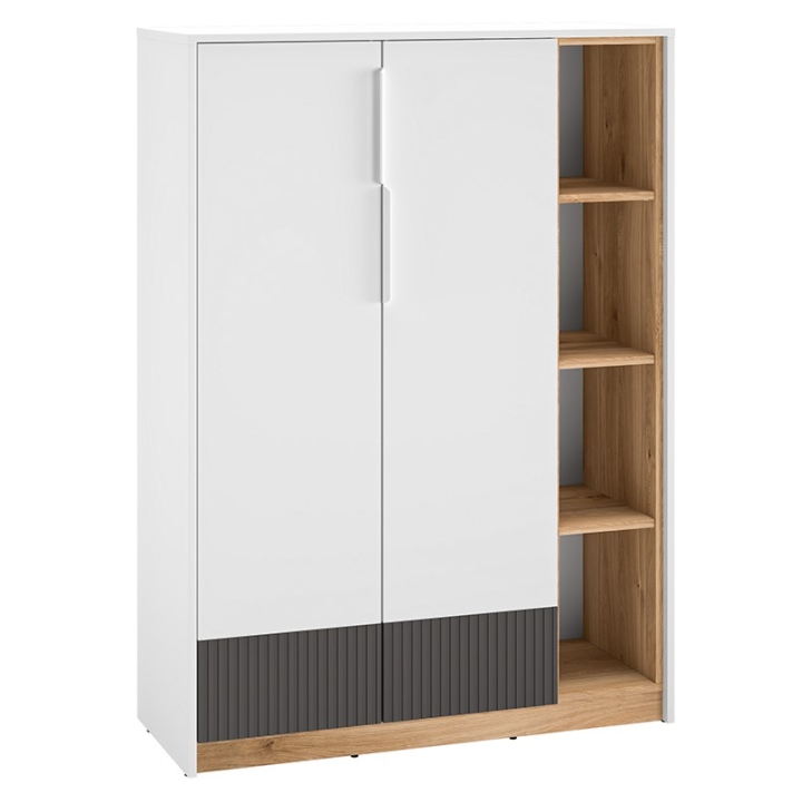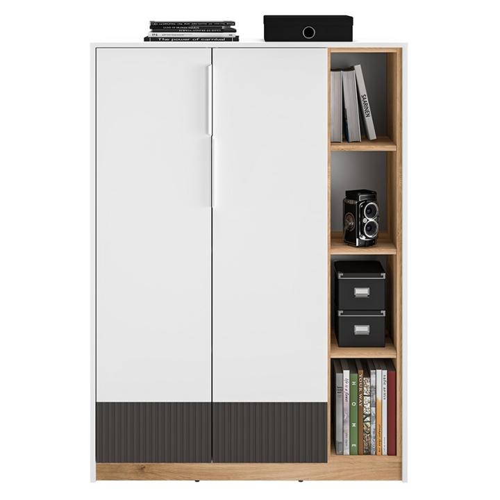Torino 05 chest of drawers from the manufacturer ML Meble is an interesting piece of furniture with versatile use. A two-door solid hides three spacious shelves providing space for storage, and additionally an adjacent bookcase with three more shelves harmonises with the interior layout of the chest of drawers. The white colour scheme with graphite accents and a light oak shade gives the entire piece a modern feel.