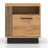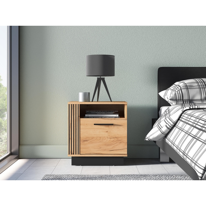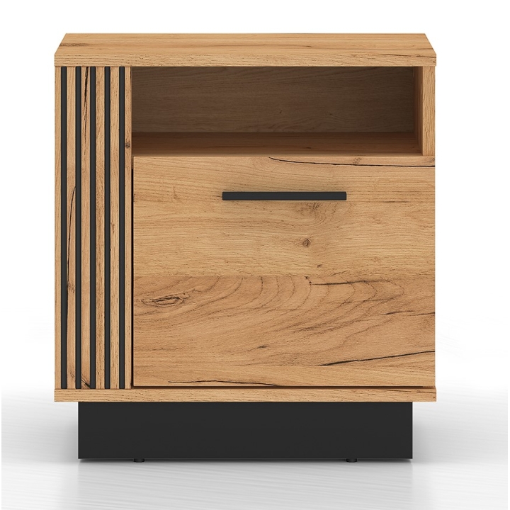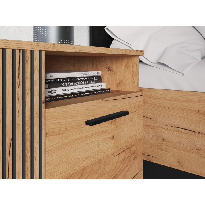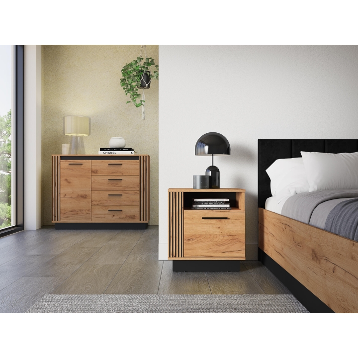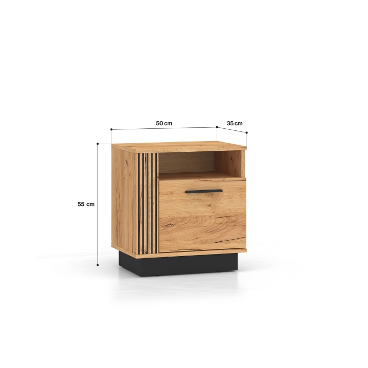 The Urso 09 bedside table by ML Meble is a compact piece of bedroom furniture that combines a modern style with a thoughtful storage layout. The dimensions of 50 × 55 × 35 cm make it a perfect fit for both larger and smaller interiors. Front in oak craft gold with black accents and decorative piping on the side , which give the furniture an original look. The carcass is made of top quality laminated board, resistant to scratches, moisture and high temperatures, ensuring durability and ease of maintenance.