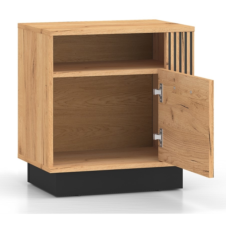 The cabinet is equipped with one door with a soft-closing mechanism, which allows for smooth and noiseless opening. There is a shelf inside to organise handy items such as books, documents or everyday accessories. The possibility of mounting the door as left or right (laths on the left or right side) gives greater freedom in adjusting the furniture to individual user needs. The ABS edge banding strengthens the edges and protects against mechanical damage.