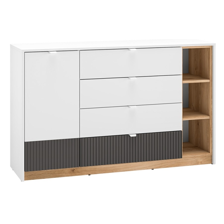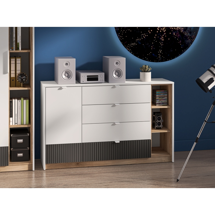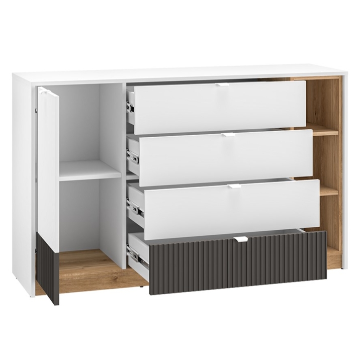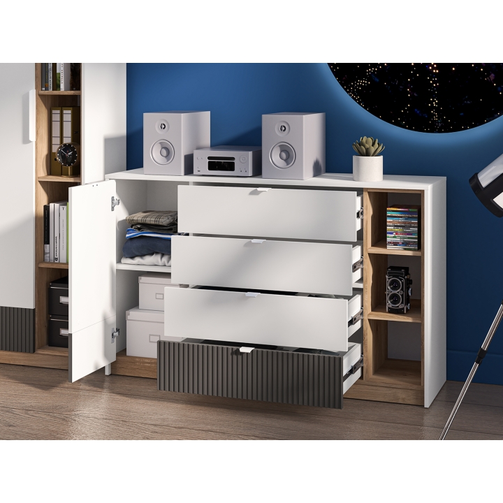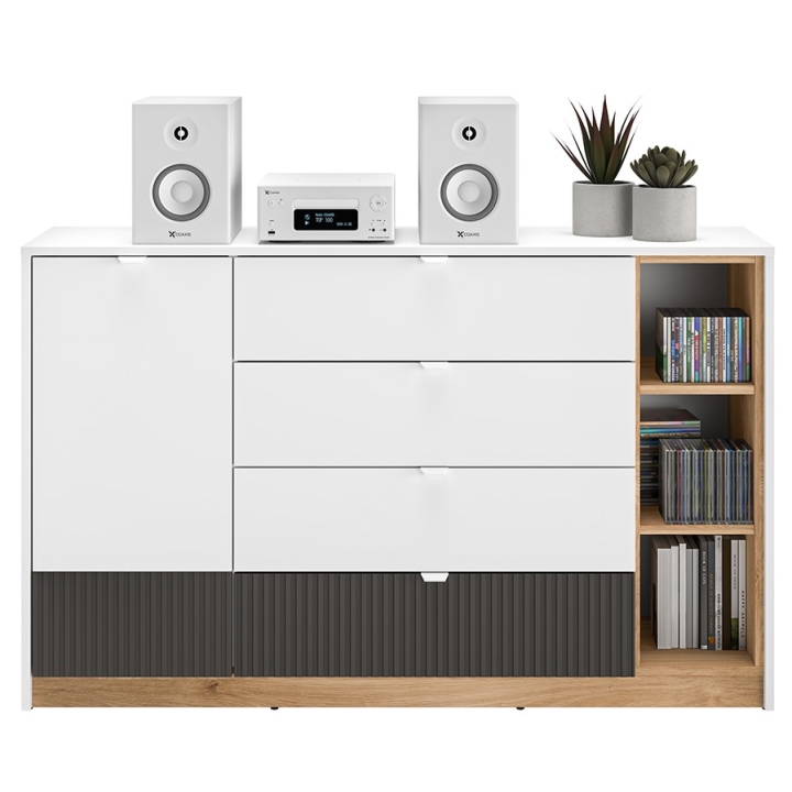 The Torino 06 chest of drawers from ML Mebleo dimensions: width138 cm, depth 40 cm, height 86 cm. is a combination of white with graphite accents and Castello oak decor, which gives it a distinctive look. Four drawers provide storage space and the lower drawer stands out with its graphite front, creating a subtle visual accent. In addition, the chest of drawers has one door, behind which there is a shelf, and an extension in the form of a bookcase with three shelves, which increases its capacity and arrangement possibilities.