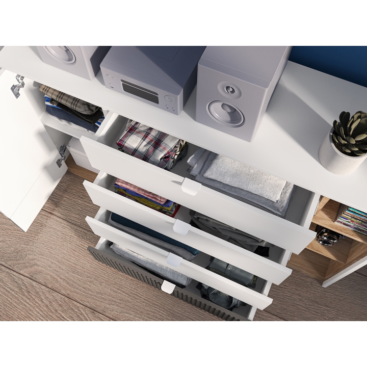 Thanks to the carefully selected materialsand refined details, the Torino 06 chest of drawers harmoniously combines functional qualities with an attractive appearance. The classic colours of white and oak Castello, broken with graphite accents, make the furniture fit into a variety of interior arrangements.