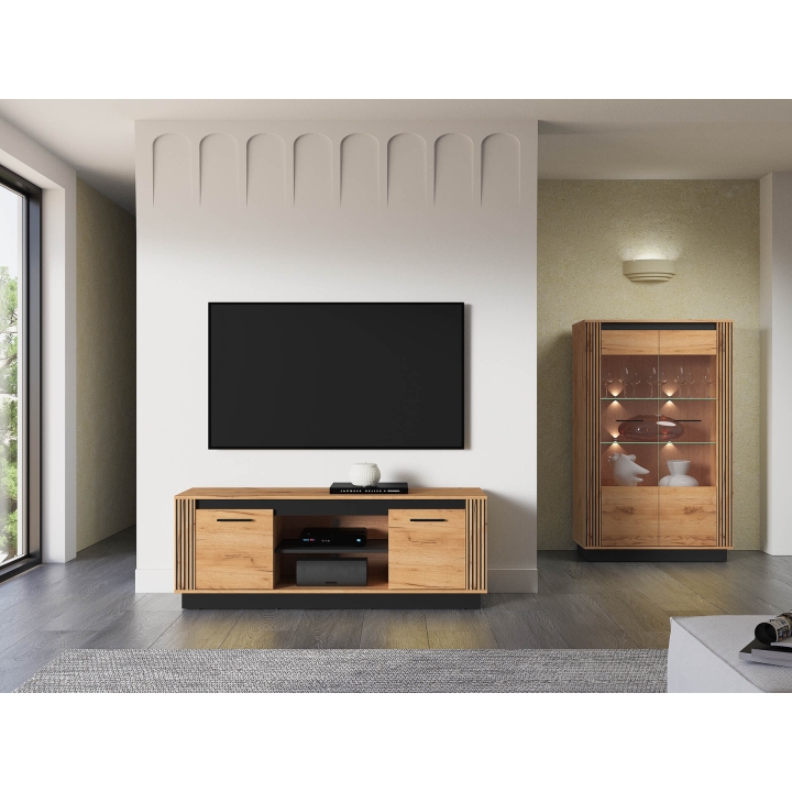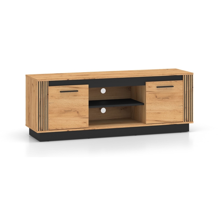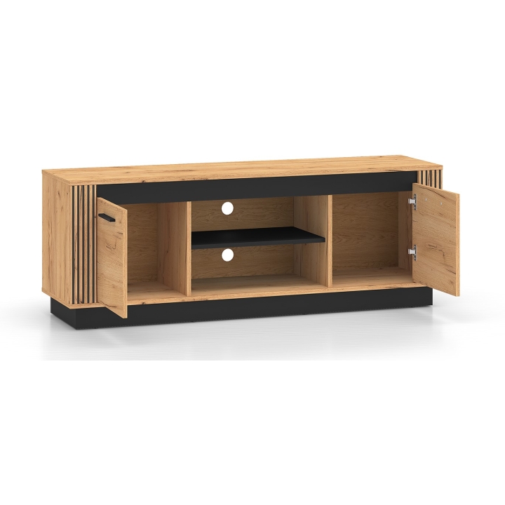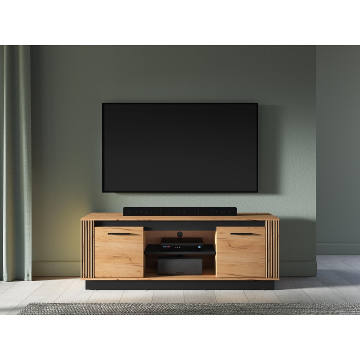 The RTV cabinet is equipped with two lockable cabinets and an open shelf in the middle, thanks to which it offers space for both storing and displaying electronic equipment or decorations. The quiet closing mechanism ensures comfortable use of the doors, while the sturdy construction allows for stable positioning of the TV and other equipment.