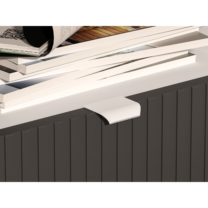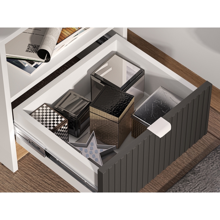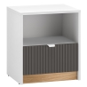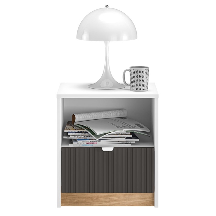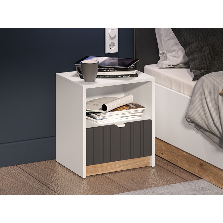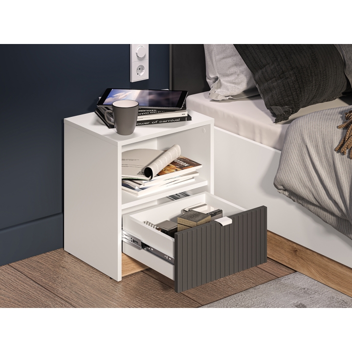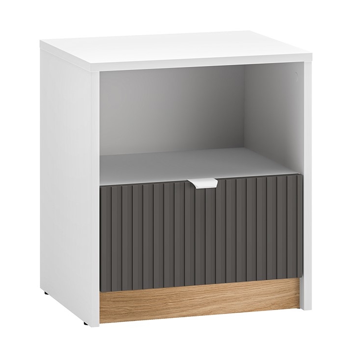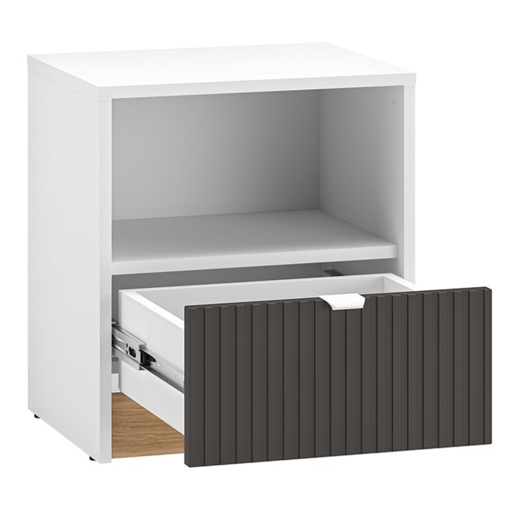 The model features a capacious drawer with a graphite front and white handle for storing small items. Above it, there is an open recess that provides quick access to the things you need within easy reach. This makes the cupboard a convenient solution for the bedroom, whether as a place for a book, phone or other daily essentials.
