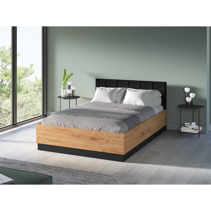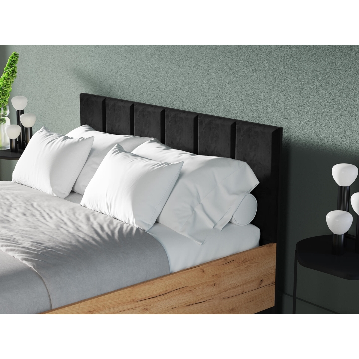 The bed dimensions are 145 × 208 cm x , and the sleeping surface is designed for a 140 × 200 cm mattress. The height of the headrest is 90 cm, which provides comfortable support while resting. The combination of black , vertically stitched velour with a warm shade of wood makes the bed fit perfectly into modern and loft arrangements, and is the ideal element of a bedroom.