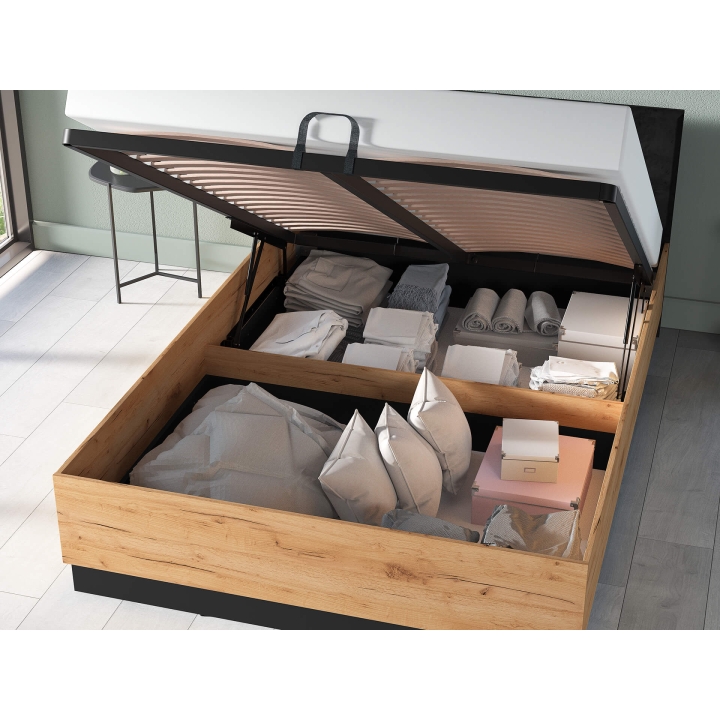 Bed with a container Urso 1301 by ML Meble is a modern model with a minimalist design, combining an upholstered black headrest with a body in oak Craft Gold decor. The construction made of laminated board and upholstered headrest gives the furniture a unique character and ensures durability for years. The ABS edge banding additionally protects the edges from damage, increasing resistance to moisture and scratches.