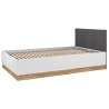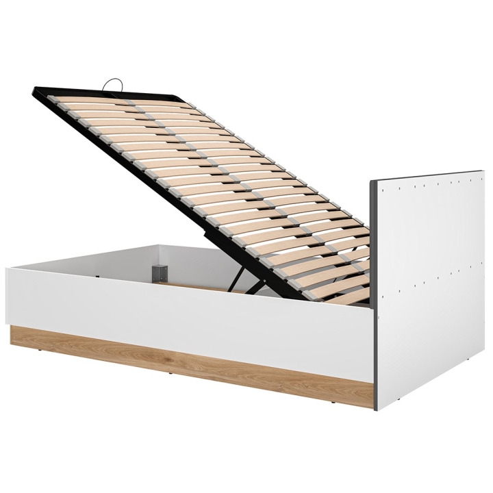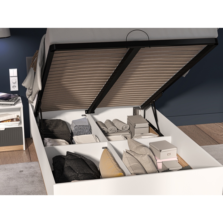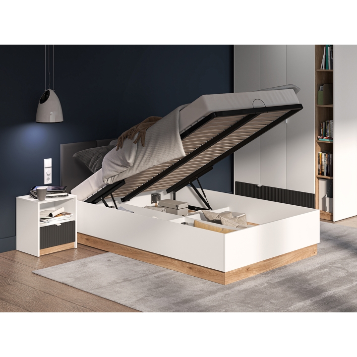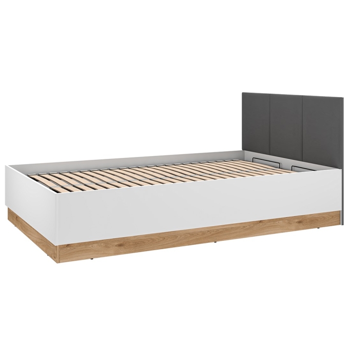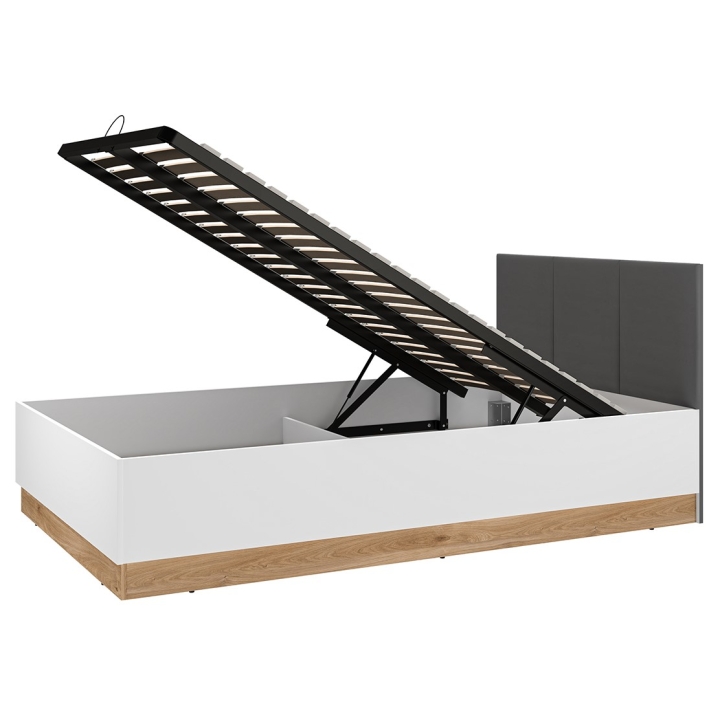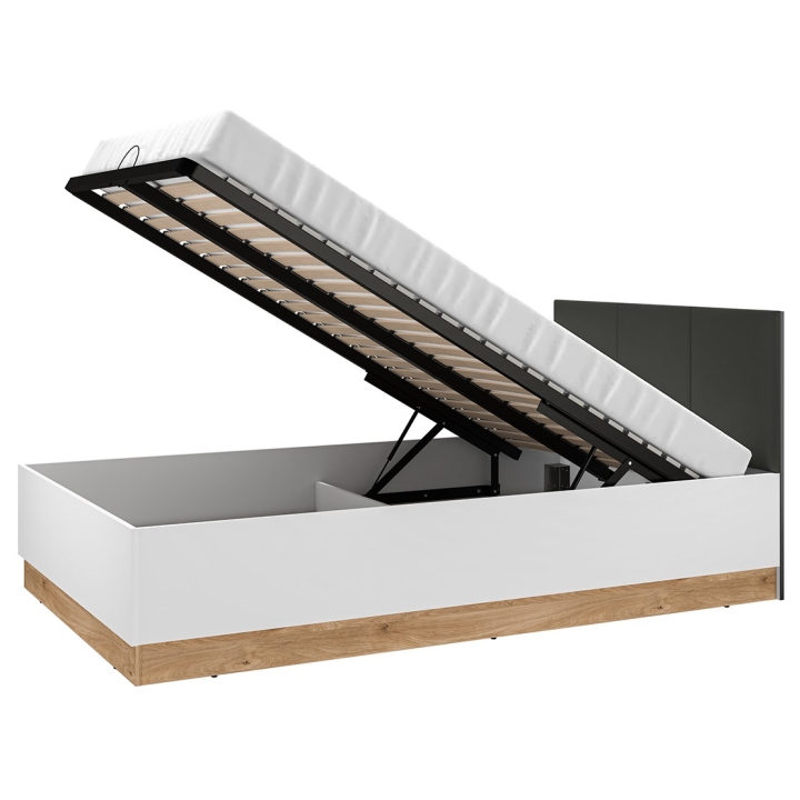 The Torino 1201 bed from ML Meble is a model equipped with a lifting frame, which allows full use of the space under the mattress for storing bedding and other textiles. Its design combines white, graphite and a light oak shade, which gives it a modern character. The headboard upholstered in dark graphite velour contrasts with the lighter finish, and the lower part of the furniture is accentuated with a decorative accent in oak.