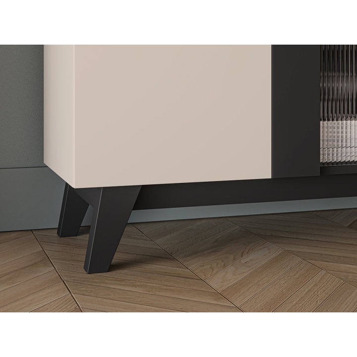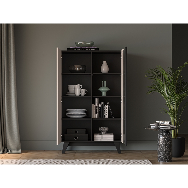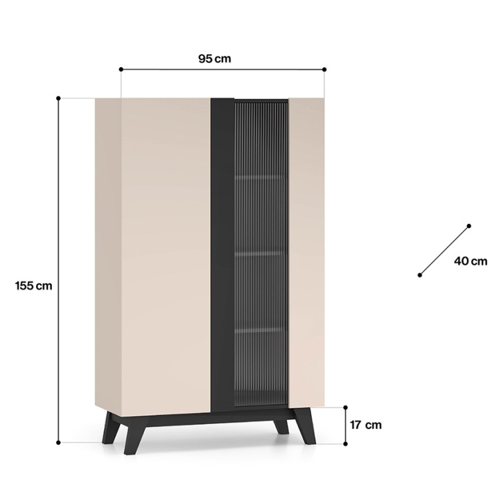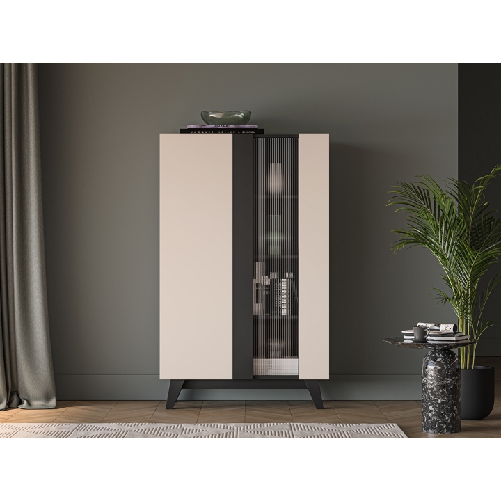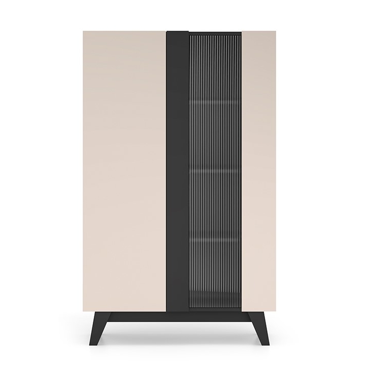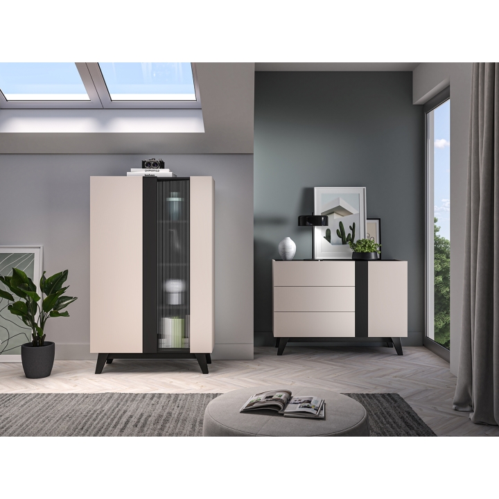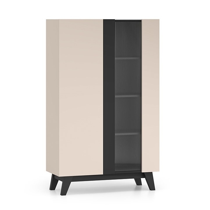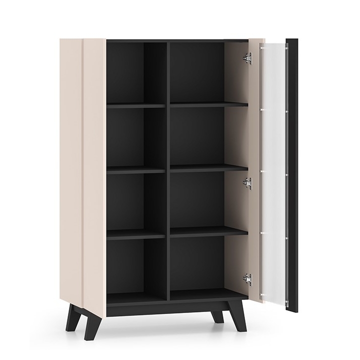 The Freshion 02 two-door display cabinet from ML Meble is a combination of modern aesthetics with a thoughtful interior layout. The cashmere shade of the fronts and sides was emphasised with contrasting black details. Such a colour combination is in line with current trends and adds a distinctive character to the furniture.
