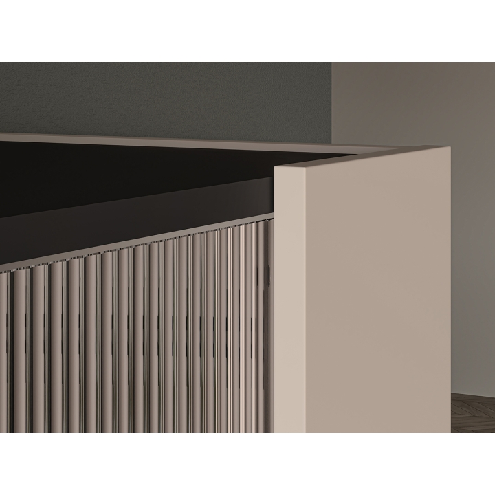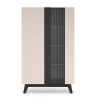 The display cabinet was designed for storing and displaying items. The interior is divided into eight capacious niches, which can accommodate both decorations and everyday objects. The left side of the furniture hides a space closed with a full door, ideal for textiles or documents. The right side of the unit is equipped with a door made of textured glass. The fluted surface subtly diffuses light, creating an effect of depth and lightness. The objects stored inside gently shine through, giving the display a unique appearance.
