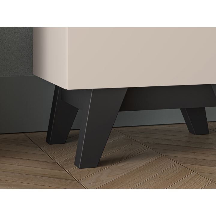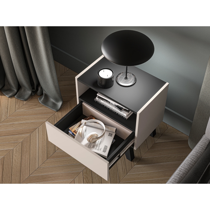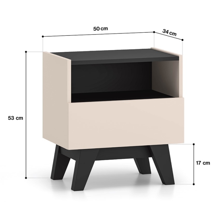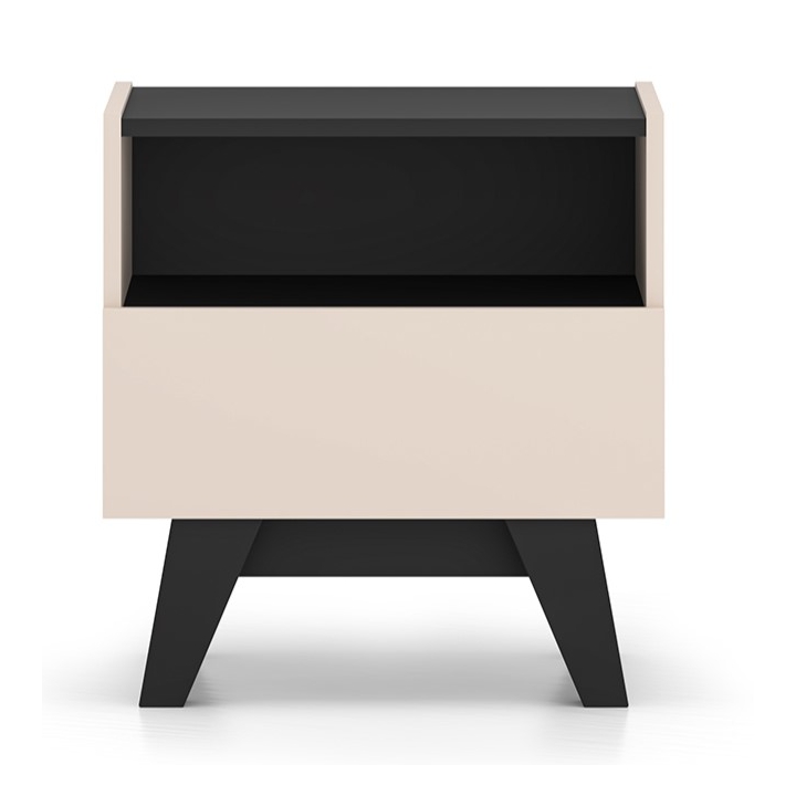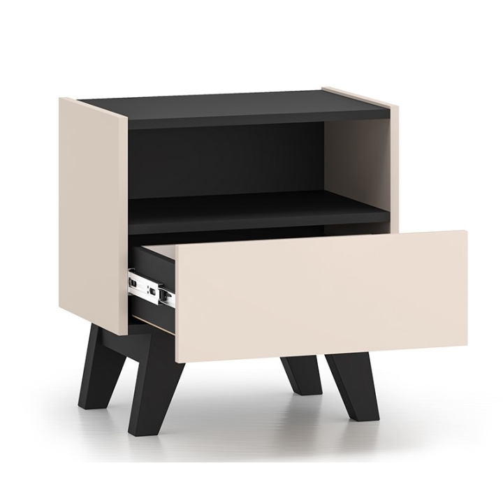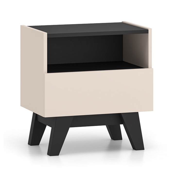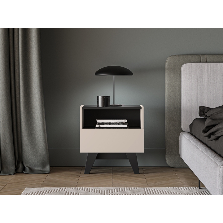 The Freshion 06 bedside cabinet from ML Meble is distinguished by the cashmere colour of the fronts and sides, juxtaposed with black accents in the form of the top, base and subtle insert. Slender legs and handleless fronts emphasise the modern character of the furniture. Its compact form is perfect for complementing the bedside space.