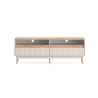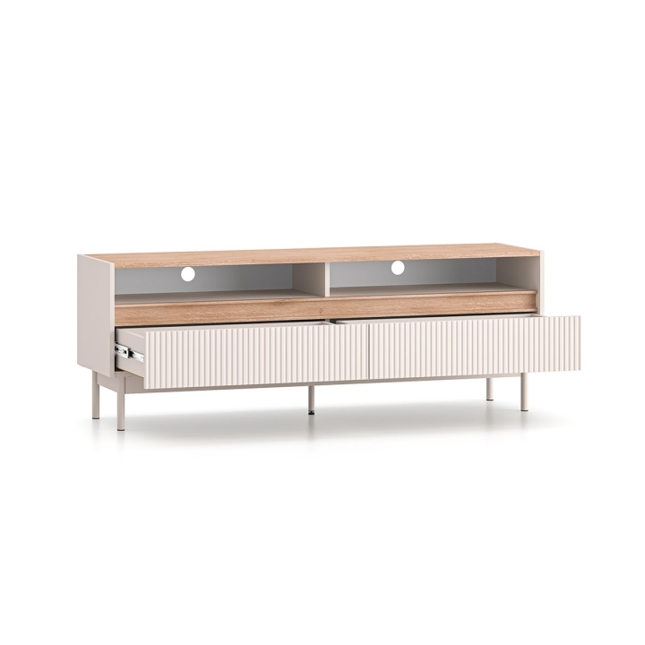 The colour scheme of the fronts and carcass in the colour of Cashmere + Oak Cremona gives the whole a subtle character. The combination of muted beige with a warm shade of wood creates a harmonious composition that will find its perfect place in living spaces. The Dunea 07 RTV cabinet is a choice that emphasises attention to detail and high quality workmanship.