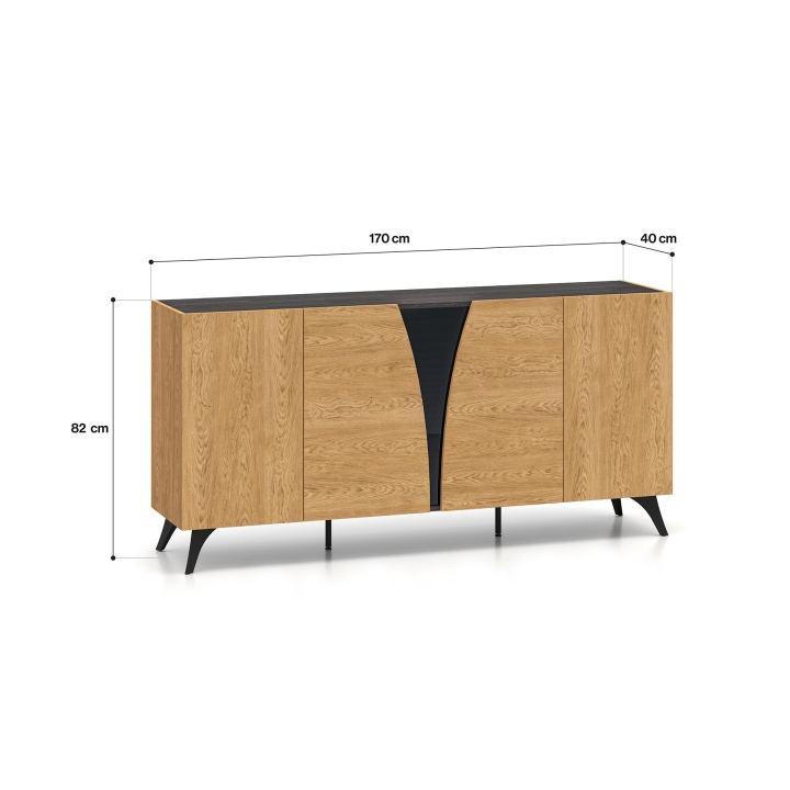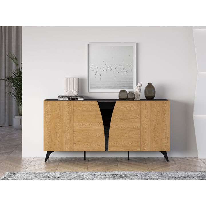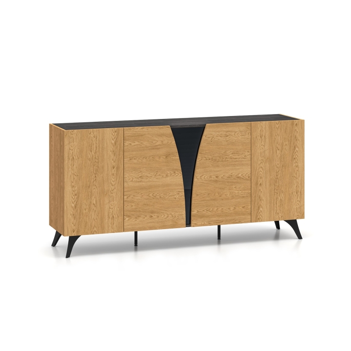 The fronts and body of the furniture are finished in Baltic Dune oak decor, juxtaposed with Portland Black ash accents and black glass. The juxtaposition of matt and glossy surfaces creates a striking contrast that attracts attention. The furniture is made of laminated board with increased durability and the edges are protected with damage-resistant ABS edging.