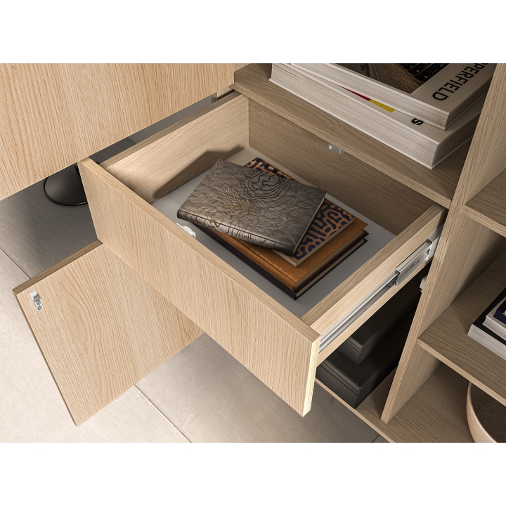 An additional highlight is the integrated LED lighting with adjustable brightness and touch control, which enhances the display and creates a cosy atmosphere. The push-to-open system keeps the fronts smooth and handle-free, while soft-close hinges ensure quiet and comfortable everyday use.