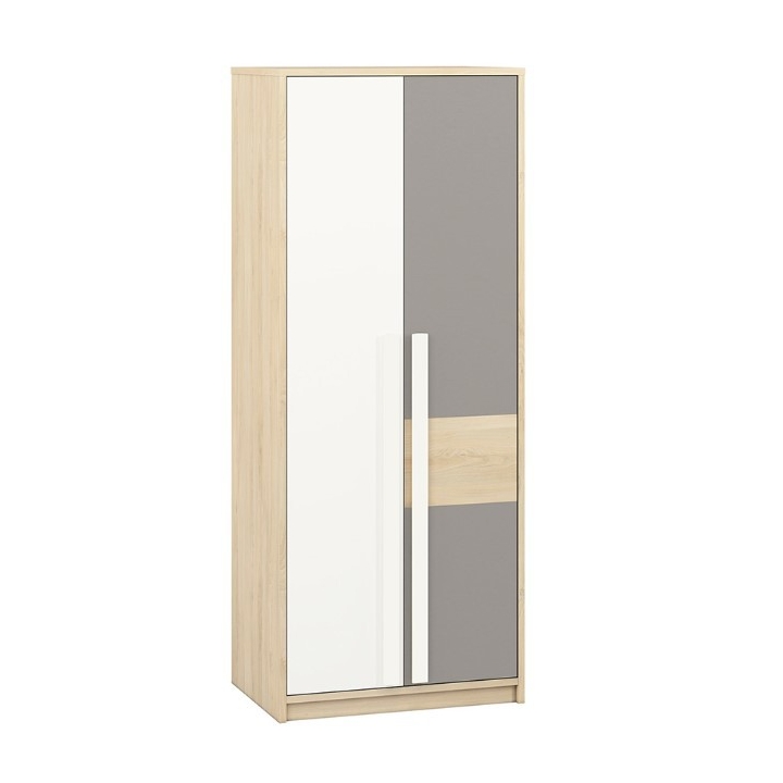 The Drop 02 two-door wardrobe created by the ML Meble brand is a combination of modern design, striking decors and a simple, geometric construction. The wardrobe fits perfectly into the design of children's and youth rooms, where we want to be guided by functionality and universal design. The possibility to choose the colours of the fronts makes the Drop 02 wardrobe look great in both girls' and boys' rooms. The entire body of the Drop 02 wardrobe is made of solid laminated board in the colour of beech fjord, resistant to mechanical damage, heat and moisture. Its edges are effectively protected by ABS edging, which protects against knocks and scratches. The Drop 02 two-door wardrobe is a model with two clothes hangers and five capacious shelves for clothes or other items. A perfect complement to the whole are stylish handles, perfectly matching the appearance of the entire piece of furniture.