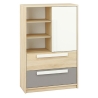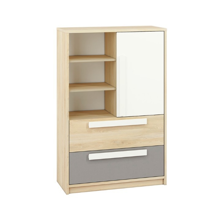 Drop 07 chest of drawers designed by the Polish brand ML Meble, impressing with its modern styling and the highest quality of workmanship. Drop furniture is a system aimed at children and young people, offering a rich palette of bright, neutral colours that are sure to appeal to girls and boys of all ages. The body of the Drop 07 chest of drawers is made of durable laminated board in the colour of beech fjord, offering unparalleled durability and resistance to mechanical damage, such as impacts, scratches and cracks, among others. In addition, the edges of the furniture have been reinforced with special ABS edging, which protects them from heat and moisture. The Drop ML Meble chest of drawers has three open shelves, next to which a cabinet with a single door and three shelves has been designed. Below it, there are two drawers with a full-extension system, offering increased storage capacity. The fronts of the furniture are available in several colours to choose from, thanks to which we are able to create the interior of our dreams. The whole is perfectly complemented by practical handles.