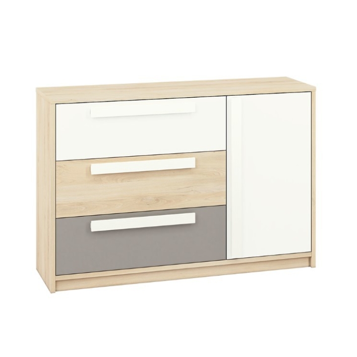 The capacious Drop 08 chest of drawers created by the ML Meble brand fits wonderfully into the modern design of a children's or youth's room. The use of simple, geometric solids and neutral colours makes it a hit in the case of both a girl's and a boy's room. The Drop 08 chest of drawers is a piece of furniture with a body made of solid laminated board in the colour of beech fjord, effectively protected against heat and moisture, as well as against mechanical damage such as impact or breakage. It is also worth noting the edge reinforcements in the form of ABS edging, which protect against potential impacts. The Drop 08 chest has three drawers with a full-extension system and increased load capacity, as well as a cabinet with a single door, which conceals two shelves for small items. The whole is wonderfully complemented by fronts in several colours to choose from and practical handles.