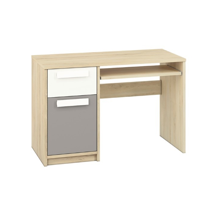 Youth desk Drop 14 by the Polish manufacturer ML Meble is a model with a simple construction, which is dominated by expressive, surprising details. The desk is recommended as an element of decoration of a child's or youth's room, and the possibility to choose the colour scheme makes it appeal to both boys and girls. The entire structure of the Drop 14 desk was made of high-quality laminated board, which is resistant to mechanical damage, such as impacts or cracks, as well as high temperatures or moisture. The edges of the furniture are protected by ABS edging, thanks to which we are not afraid of any impacts or cracks. The Drop 14 desk features a large work surface with a pull-out keyboard shelf underneath, and a shelf with a drawer and single door and two shelves for office supplies. The entire body of the desk is kept in a light colour scheme of fjord beech, with coloured inserts added.