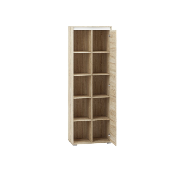 Avo 06 single-door bookcase created by the Polish manufacturer ML Meble delights with its great arrangement of space to be used, modern style and warm colours. The simple, minimalist form of the piece of furniture blends wonderfully with Scandinavian and modern interior design - a living room, bedroom or youth room. The Avo 06 bookcase was made of high-quality laminated board in the colour of light sonoma, which is characterised by increased resistance to mechanical damage (impacts, scratches, cracks), as well as to high temperatures and moisture. In addition, the edges of the Avo 06 bookcase have been reinforced with ABS edging, which effectively protects the piece of furniture against the material coming loose. The tall bookcase Avo 06 is divided into two parts - an open one with five capacious shelves for storage, and a closed one with a single door and shelves inside. At the top, an eye-catching strip has been used in one of three colours to choose from: alpine white, light sonoma or anthracite. The whole is completed by a stylish yet practical handle at the door.