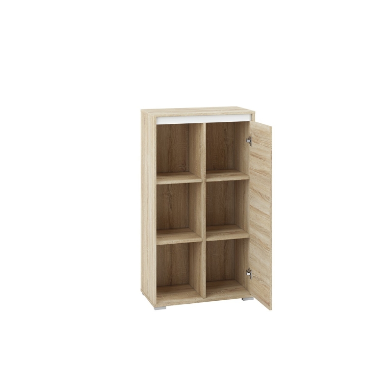 The Avo 08 chest of drawers, designed by the Polish brand ML Meble, wonderfully reflects the simplicity and minimalism typical of the entire Avo furniture collection. The chest of drawers was created in such a way that it can be easily matched to the minimalist interior design and arranged in a Scandinavian style. The Avo 08 chest of drawers is made of high-quality laminated board in the colour of light sonoma, which guarantees resistance to mechanical damage (impacts, scratches, cracks), as well as to high temperatures and moisture. The chest of drawers is divided into two parts: an open one with three shelves for various items, and a closed one with a single door, behind which another three shelves for storage are hidden. The entire structure of the furniture is aesthetically complemented by an insert in the upper part of the chest, available in three colours (light sonoma, alpine white or anthracite), as well as a handle in the cabinet door.
