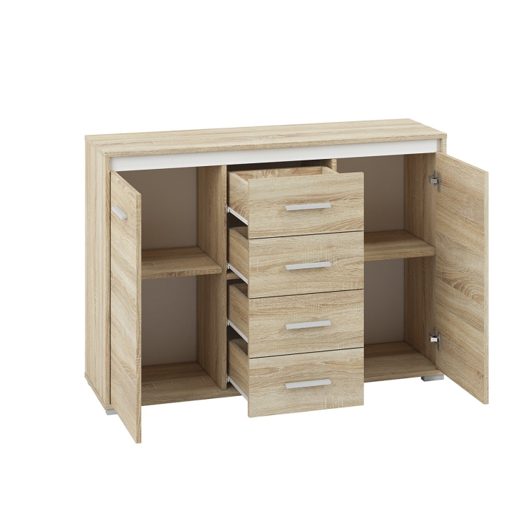 Avo 14 chest of drawers created by the Polish manufacturer ML Meble is a unique proposal for modern and minimalist interiors - living room, bedroom or teenager's room. The chest of drawers was maintained in natural, warm colours, thanks to which it perfectly reflects the Scandinavian climate - natural and beautiful in its simplicity. The Avo 14 chest of drawers was made of solid laminated board, resistant to heat and moisture, as well as to mechanical damage, such as impacts, scratches and cracks. The edges of the ML Meble chest of drawers are additionally reinforced with ABS edging, thanks to which we do not have to worry about the material peeling off. The Avo 14 chest of drawers presents a great arrangement of space and really a lot of storage space. On the sides, there are two cabinets with single doors, inside of which we will find two capacious shelves each. In the middle section, four drawers have been designed with a full-extension system and increased capacity. The whole is wonderfully complemented by the top rail available in three colours (alpine white, anthracite, light sonoma), as well as striking handles, which wonderfully combine with the warmth of light sonoma wood.