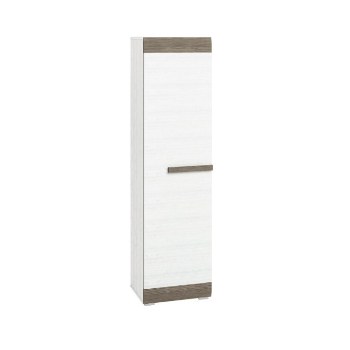 Blanco 03 underwear cabinet by the Polish brand ML Meble is a perfect proposal for a living room or a lounge, where we want to enjoy modern design and unusual functionality. Blanco is a collection that delights with simple, geometric solids and subdued colours - snow pine with imitation of natural wood structure and MDF New Grey. ML Meble underwear was made of durable laminated board, which is resistant to mechanical damage (e.g. knocks, scratches, cracks), as well as to high temperatures and moisture. An additional advantage is the edge reinforcement in the form of ABS edging, which protects against peeling or distortion of the material. Blanco 03 is a narrow piece of furniture with a single door and an aesthetic handle, inside of which there are five shelves for storing clothes or other items. The elegant form of the furniture is wonderfully emphasised by contrasting inserts in grey tones.
