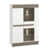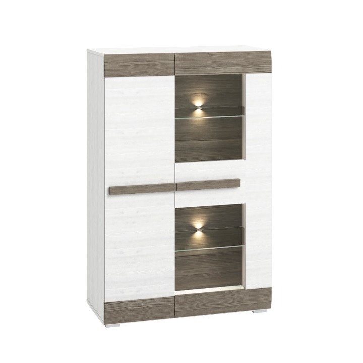 The Blanco 05 vitrine created by the Polish manufacturer ML Meble presents us with a wonderful combination of modern, minimalist form and incredible aesthetics of execution. The vitrine was maintained in a natural, subdued colour scheme, which combines the universal white of snow pine and the light grey of New Grey. Blanco 05 display cabinet was made of top quality laminated board, which is resistant to mechanical damage (impacts, scratches, etc.), as well as high temperatures and moisture. In addition, the edges of the furniture were reinforced with ABS edging to protect them against unstuck or deformed material. Particularly noteworthy is the interior of the ML Meble cabinet, divided into two parts. On the left side, we have a single door, inside of which we will find three shelves and four shelves for various types of objects, while on the right side, a partially glazed door was designed, which reveals two shelves at the top and two shelves at the bottom. The shelves can be fitted with designer LED lighting, which wonderfully emphasises the unusual form of the furniture. The whole is wonderfully emphasised by aesthetically pleasing handles made of MDF, giving the whole a unique character.
