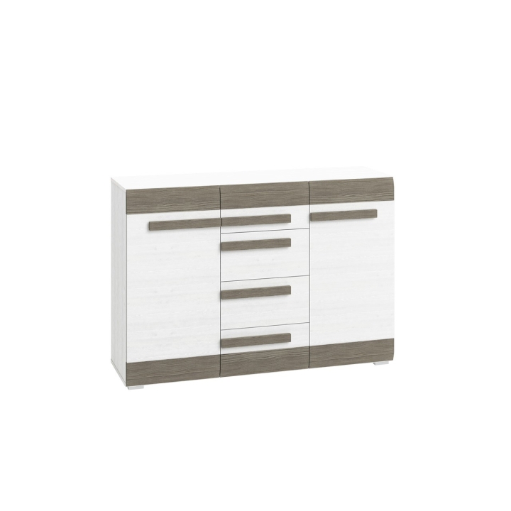 The large Blanco 07 chest of drawers produced by the Polish brand ML Meble is a wonderful decorative element for any modern and spacious living room, boardroom or office space. Its neutral, subdued colours combined with its simple, geometric design are a perfect complement to any interior arranged in Scandinavian style. The ML Meble chest of drawers was made of a very durable laminated board, which is not only resistant to scratches, knocks or cracks, but also guarantees maximum protection against moisture and high temperatures. To further strengthen the construction of the ML Meble chest of drawers, its edges have been protected with ABS edging to avoid peeling or distortion. The entire structure in the colour of snow pine was contrasted with MDF elements in the colour of New Grey - handles and top and bottom panels. The Blanco 07 chest of drawers has four drawers of varying size and capacity, ideal for storing linen and other items. On the sides there are two cabinets with single doors and plenty of interior space to spare. The Blanco chest of drawers is also available in two other configurations and sizes.