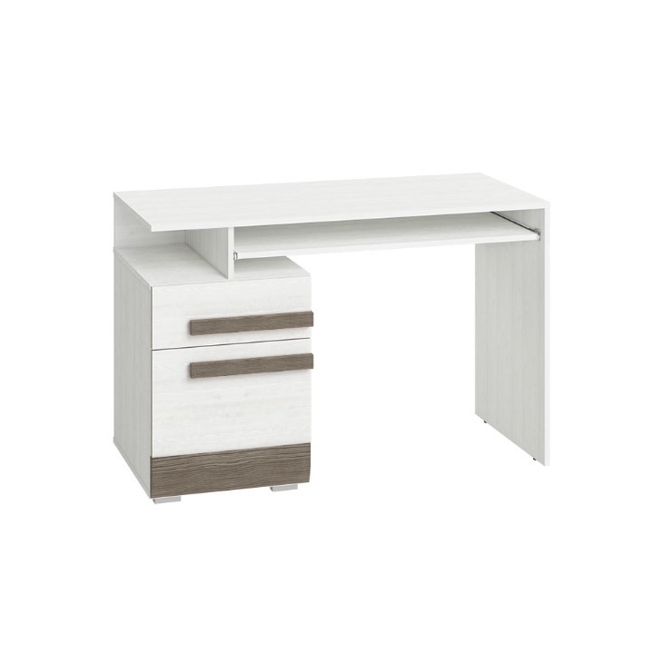 Desk Blanco 11 designed by the Polish manufacturer ML Meble is a great choice for everyone who appreciates interior minimalism and universal arrangements. The desk was kept in a light, toned down colour scheme, which allows it to match both the design of a home office or study, as well as the design of a youth room. The Blanco 11 desk is a model with an optimal work surface, with a top 119 cm wide and 55 cm deep. Thanks to this, we are able to prepare a comfortable space for ourselves to work, study or read a book. The entire structure of the ML Meble desk was made of solid laminated board, which is characterised by increased resistance to mechanical damage (impacts, cracks, scratches), as well as to high temperatures and moisture. The edges of the furniture were reinforced with ABS edging to protect them from ungluing or deformation. The Blanco 11 desk is a model with a side cabinet with a single door and a shelf for office supplies, as well as a pull-out drawer with optimum capacity. Under the top there is an open shelf and a pull-out keyboard shelf. The entire structure of the furniture is wonderfully decorated with a bottom MDF strip in New Grey, as well as stylish handles in the same colour.