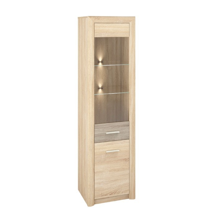 The Castel 04/S vitrine of the pillar type is a tall and elegant piece of furniture, which will perfectly complement the equipment of a living room or dining room. Combine two Castel 04/S showcases with a chest of drawers or a chest of drawers and a wall shelf to create a complete wall unit. The upper part of the furniture consists of a glass front, and behind it two glass shelves on which you can effectively display tableware, souvenirs or other objects pleasing to the eye. The shelves have three large storage recesses. Underneath is a small practical drawer and a full-door cabinet with a solid shelf inside. The 04/S tall display cabinet from the Castel collection offers plenty of storage space, and the timeless design alluding to nature and the classics ensures that the furniture piece remains in the canon of never going out of fashion trends. Explore the details of this practical piece of furniture below.