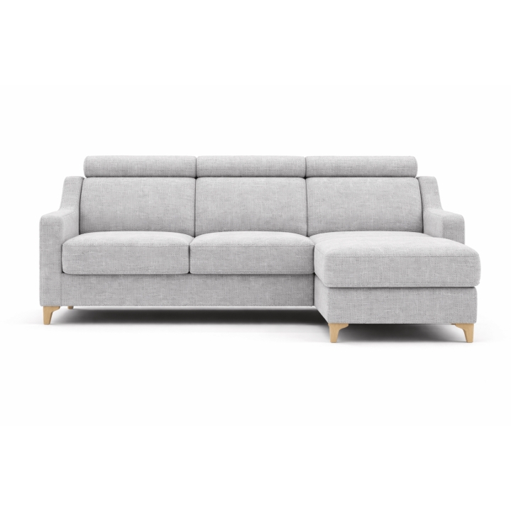 Functional Smart corner by MP Nidzica, presented in a configuration: FL + SZS P. The corner sofa belongs to a modern modular collection, which can be freely customised. Comfortable, soft seats have been combined with a profiled backrest and adjustable headrests, which can be set at different angles of inclination. The Smart corner sofa is also equipped with a sleeping function, thanks to which it can be used as a comfortable bed for two people. In the presented version, the corner sofa has a striking armrest and an extended chaise longue on the other side.